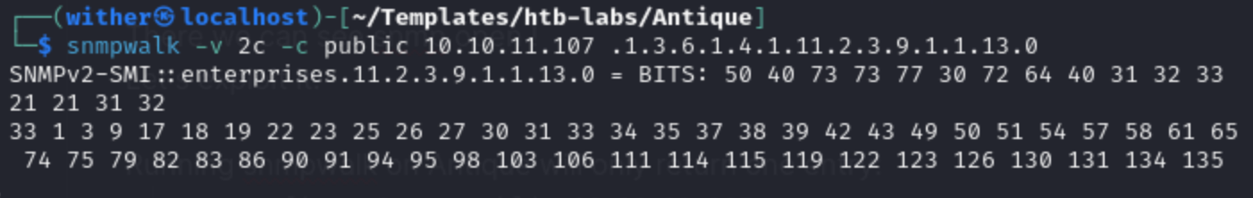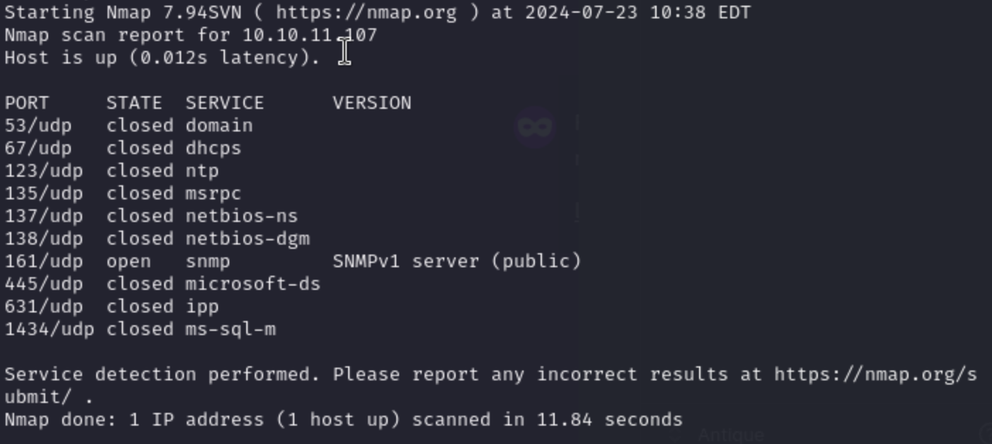 Given the last of any other paths on TCP, I’ll check back to a UDP scan. Scanning for UDP can be both slow and unreliable. I do find -sV to make the results more reliable (and probably slower), but even just looking a the top ten ports finds something interesting on Antique: 考虑到 TCP 上的最后一个其他路径,我将检查 UDP 扫描。扫描 UDP 可能既缓慢又不可靠。我确实发现 -sV 可以使结果更可靠(并且可能更慢),但即使只是查看前十个端口,也会在 Antique 上发现一些有趣的东西: