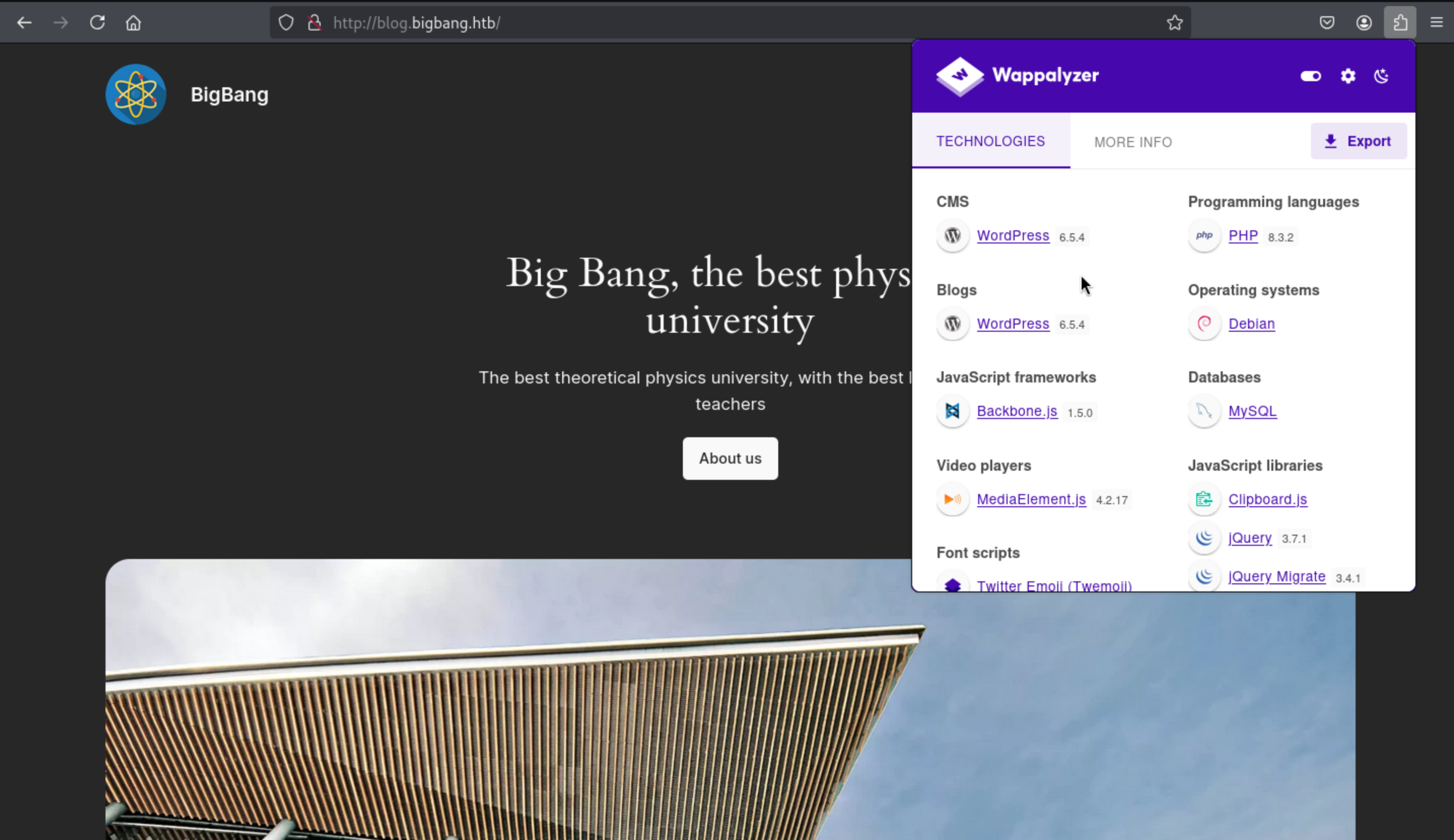 http://blog.bigbang.htb/ [200 OK] Apache[2.4.62], Country[RESERVED][ZZ], HTML5, HTTPServer[Debian Linux][Apache/2.4.62 (Debian)], IP[10.10.11.52], JQuery[3.7.1], MetaGenerator[WordPress 6.5.4], PHP[8.3.2], PasswordField[pwd], Script[importmap,module,text/html,text/javascript], Title[BigBang], UncommonHeaders[link], WordPress[6.5.4], X-Powered-By[PHP/8.3.2]
