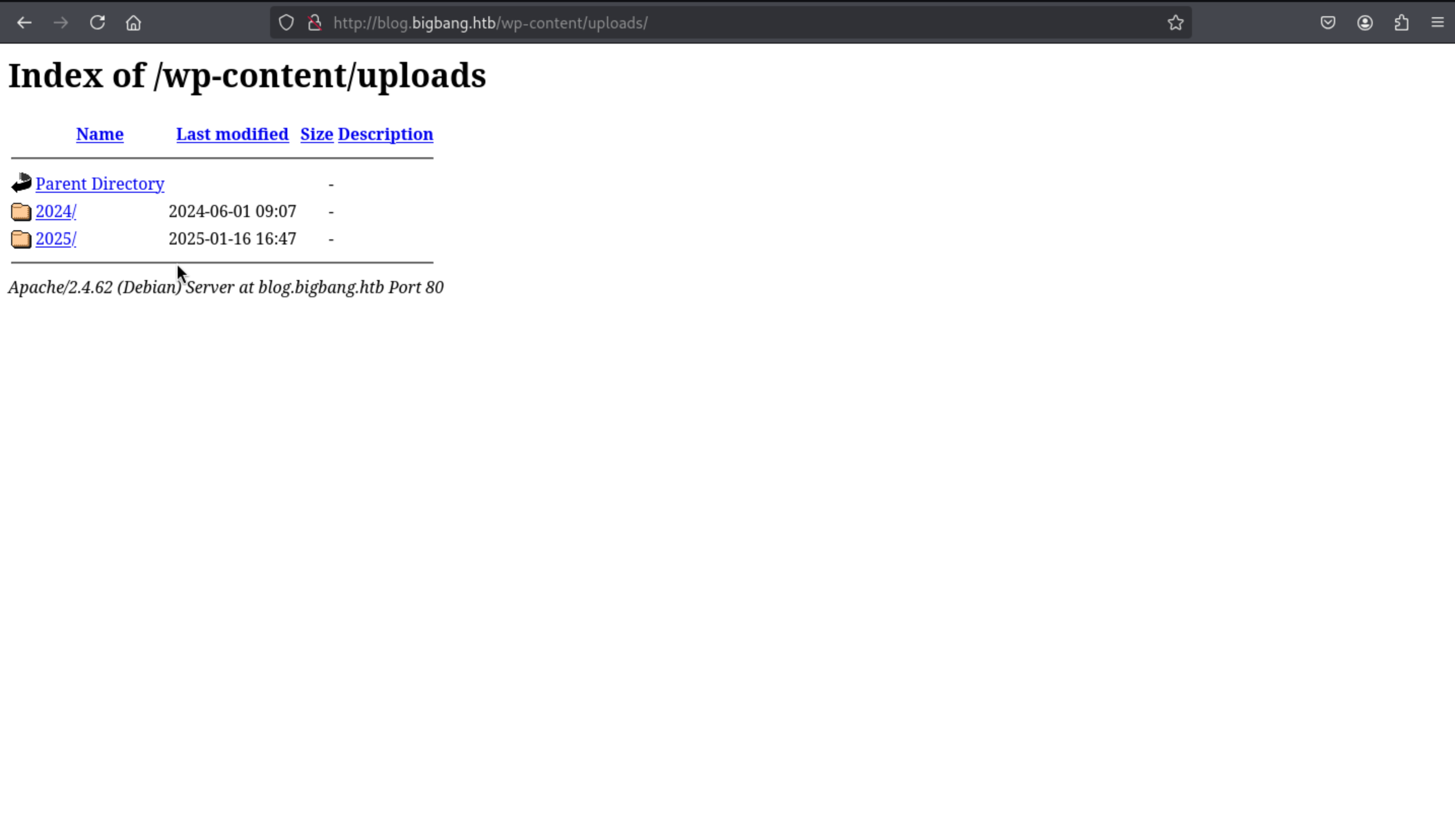[+] Upload directory has listing enabled: http://blog.bigbang.htb/wp-content/uploads/