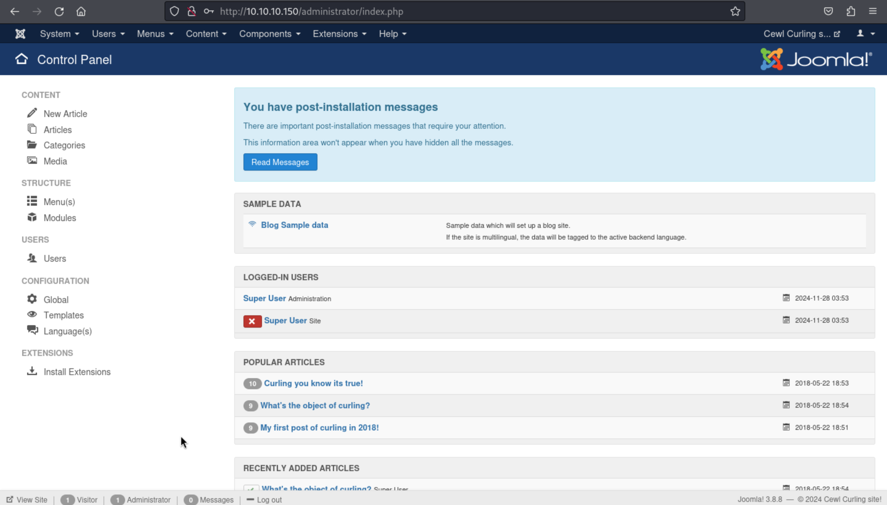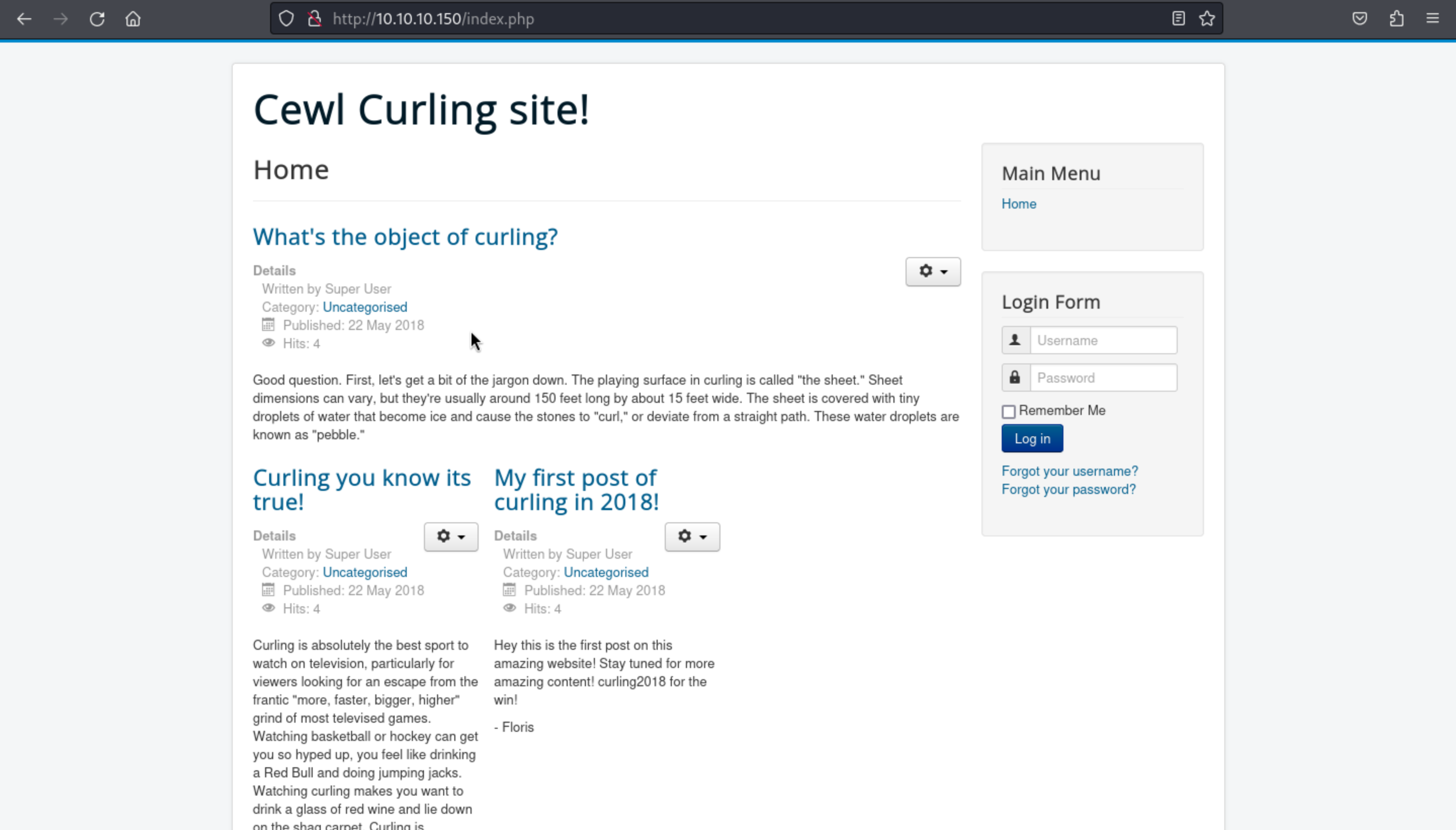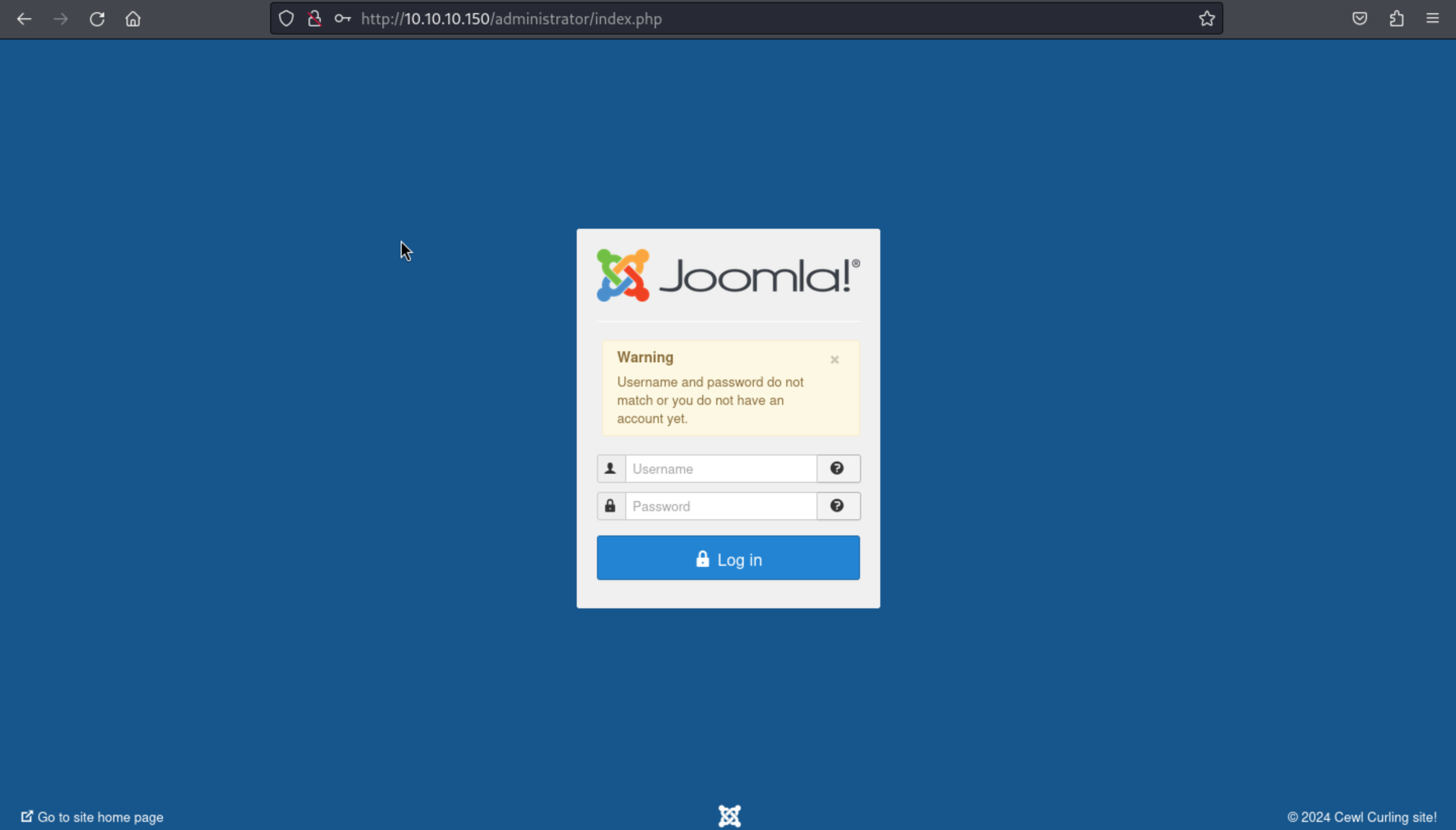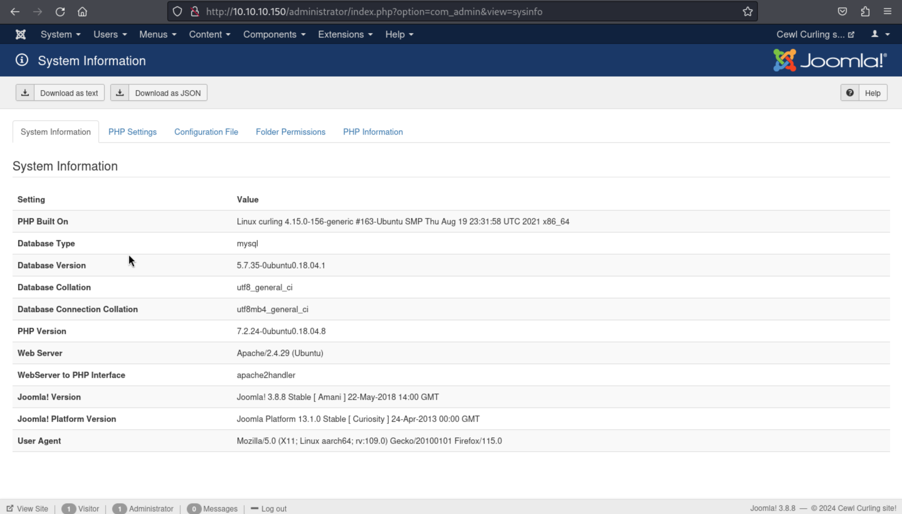 http://10.10.10.150 [200 OK] Apache[2.4.29], Bootstrap, Cookies[c0548020854924e0aecd05ed9f5b672b], Country[RESERVED][ZZ], HTML5, HTTPServer[Ubuntu Linux][Apache/2.4.29 (Ubuntu)], HttpOnly[c0548020854924e0aecd05ed9f5b672b], IP[10.10.10.150], JQuery, MetaGenerator[Joomla! - Open Source Content Management], PasswordField[password], Script[application/json], Title[Home]