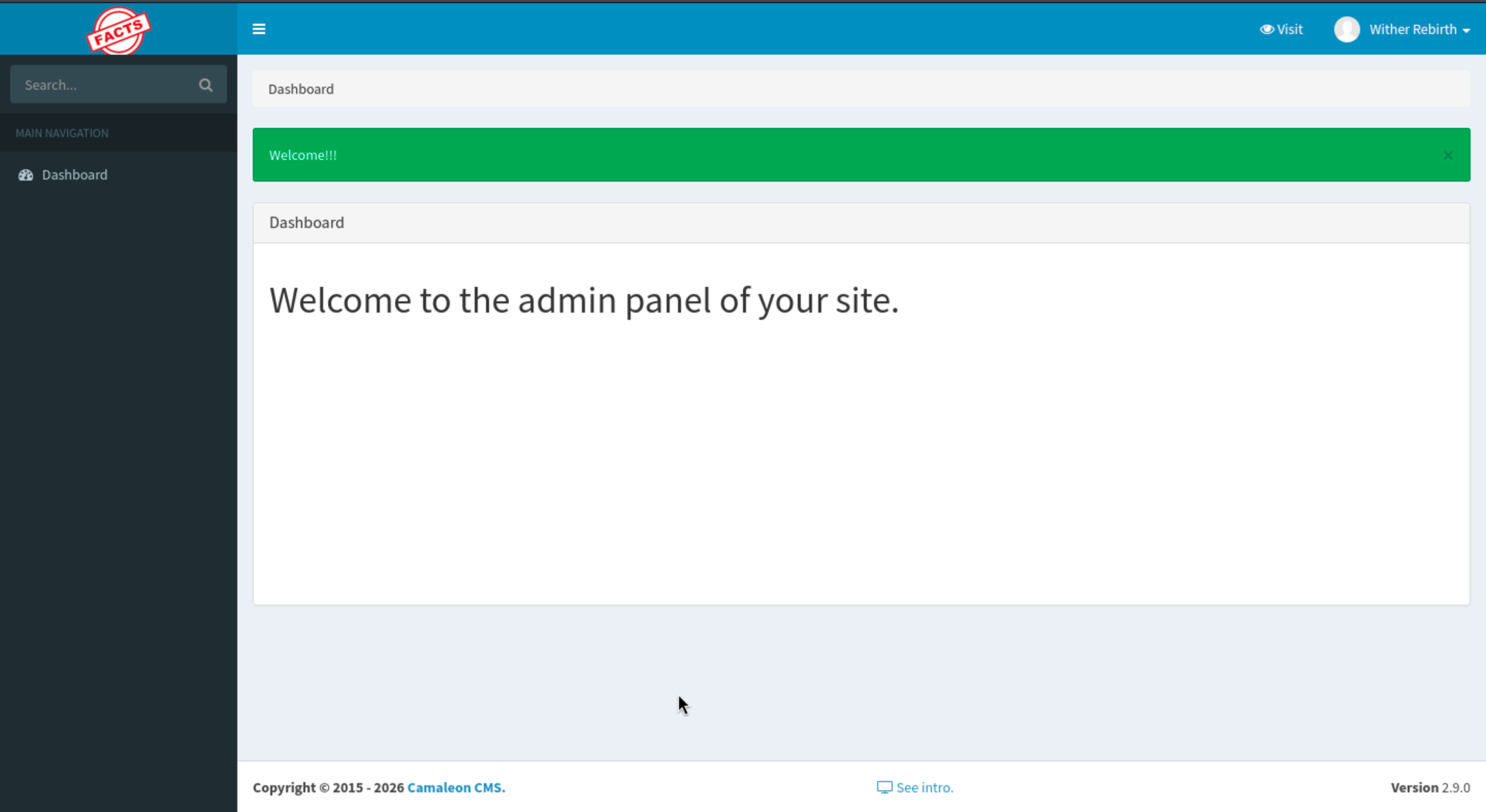 Now we can access to the admin panel and we can find the version of this service Camaleon CMS 2.9.0