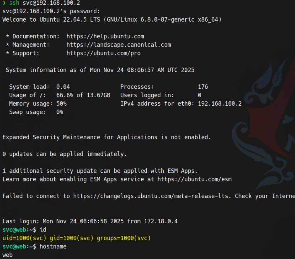 We also observed SSH open on the web container (192.168.100.2), namely the Docker bridge at 172.18.0.1. Let's aim for direct lateral SSH access using the admin password (Friesf00Ds2025!!) with its OS username (svc): Let's try using the administrator password (Friesf00Ds2025!!) and the operating system username (svc) for direct lateral SSH access.