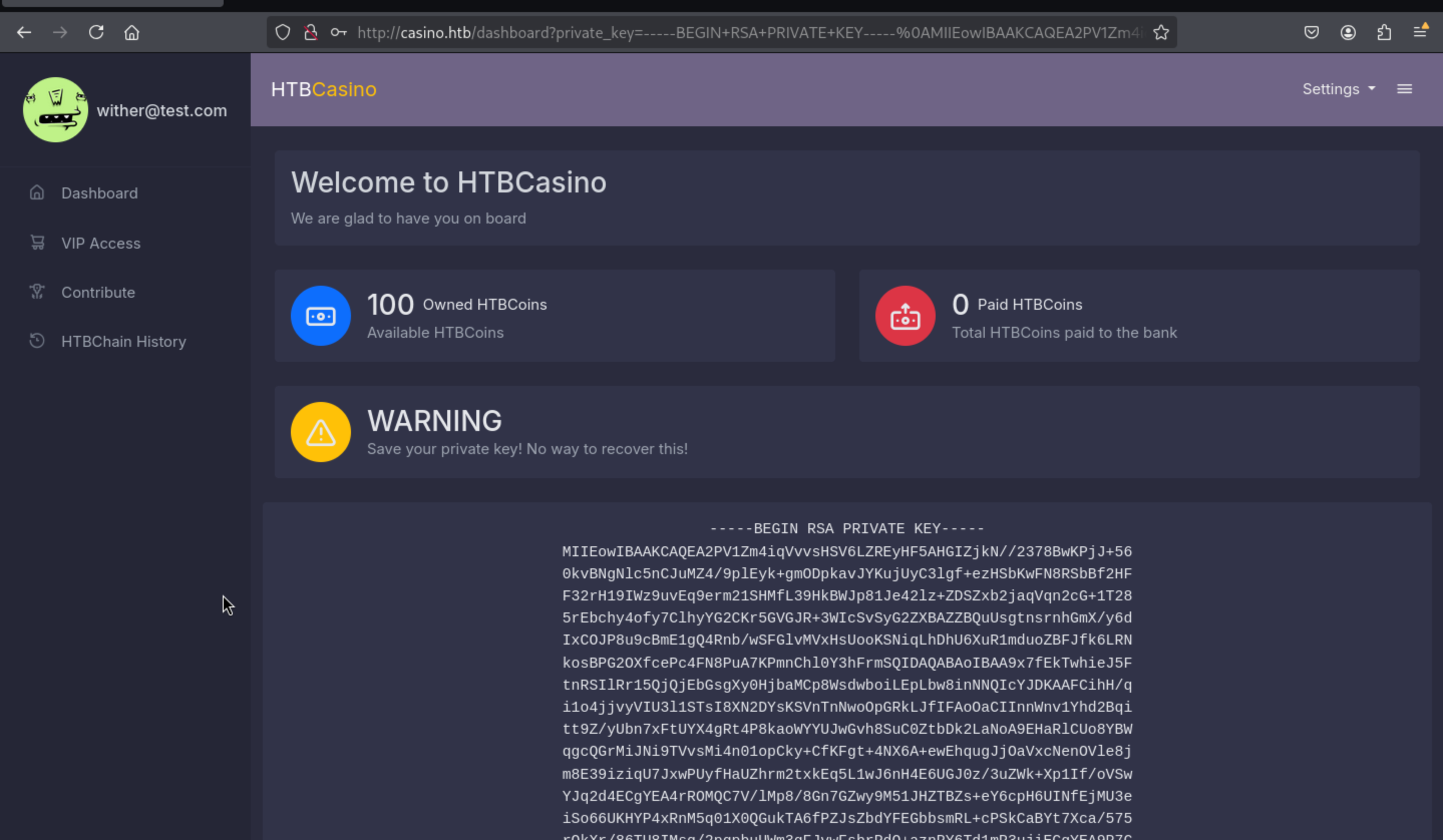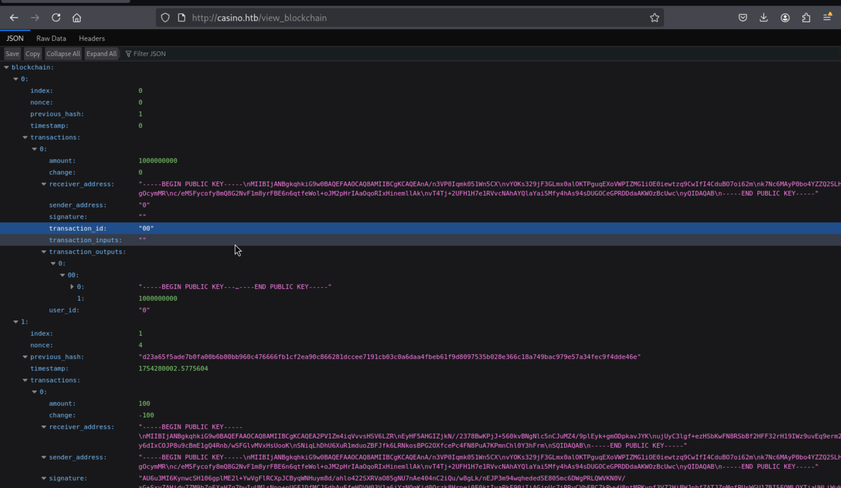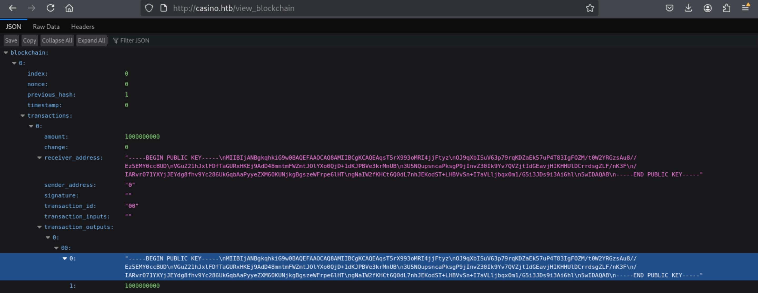 Firstly, we need to get the the private and public key (we can see public key on http://casino.htb/view_blockchain at receiver_address)