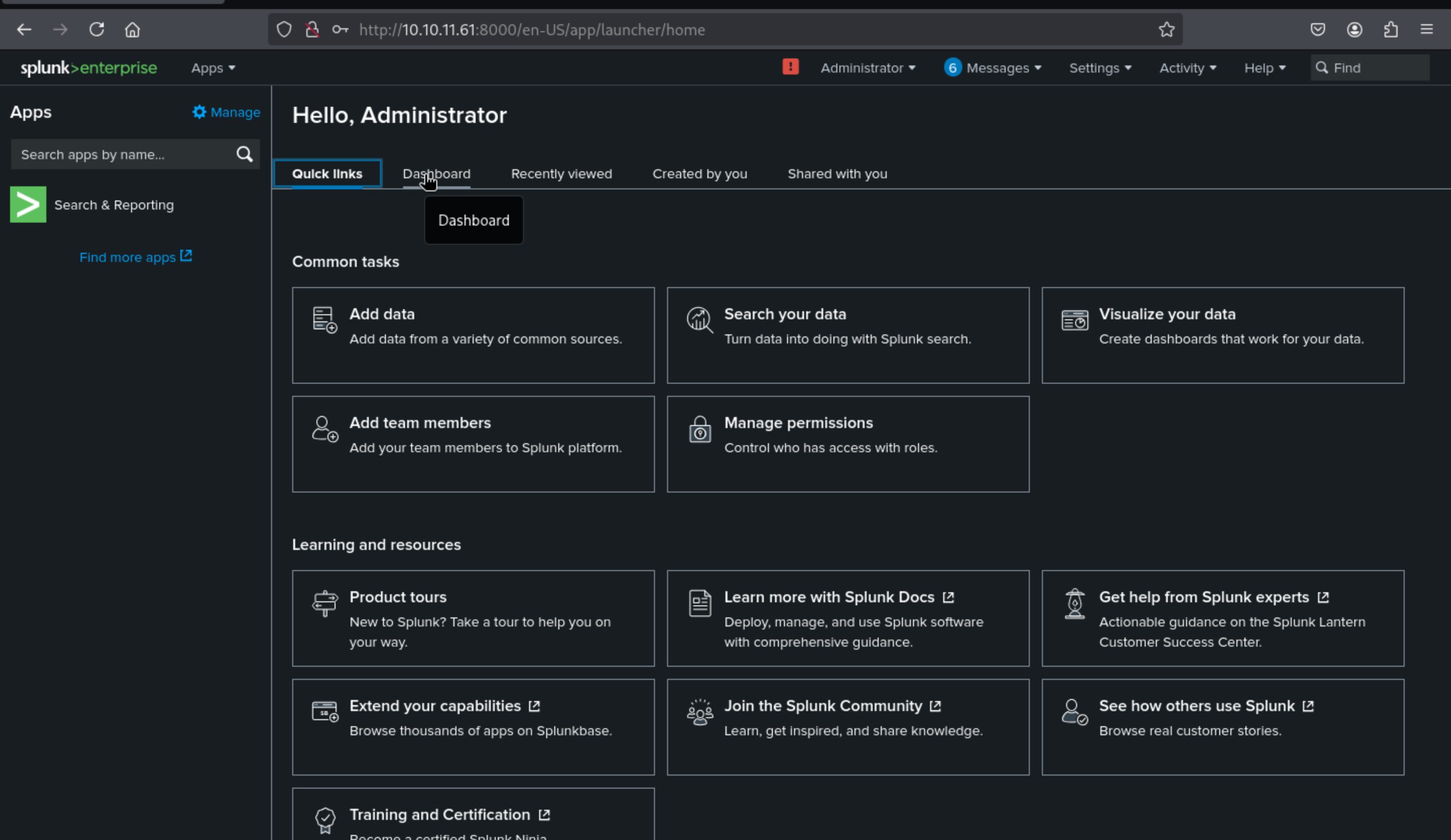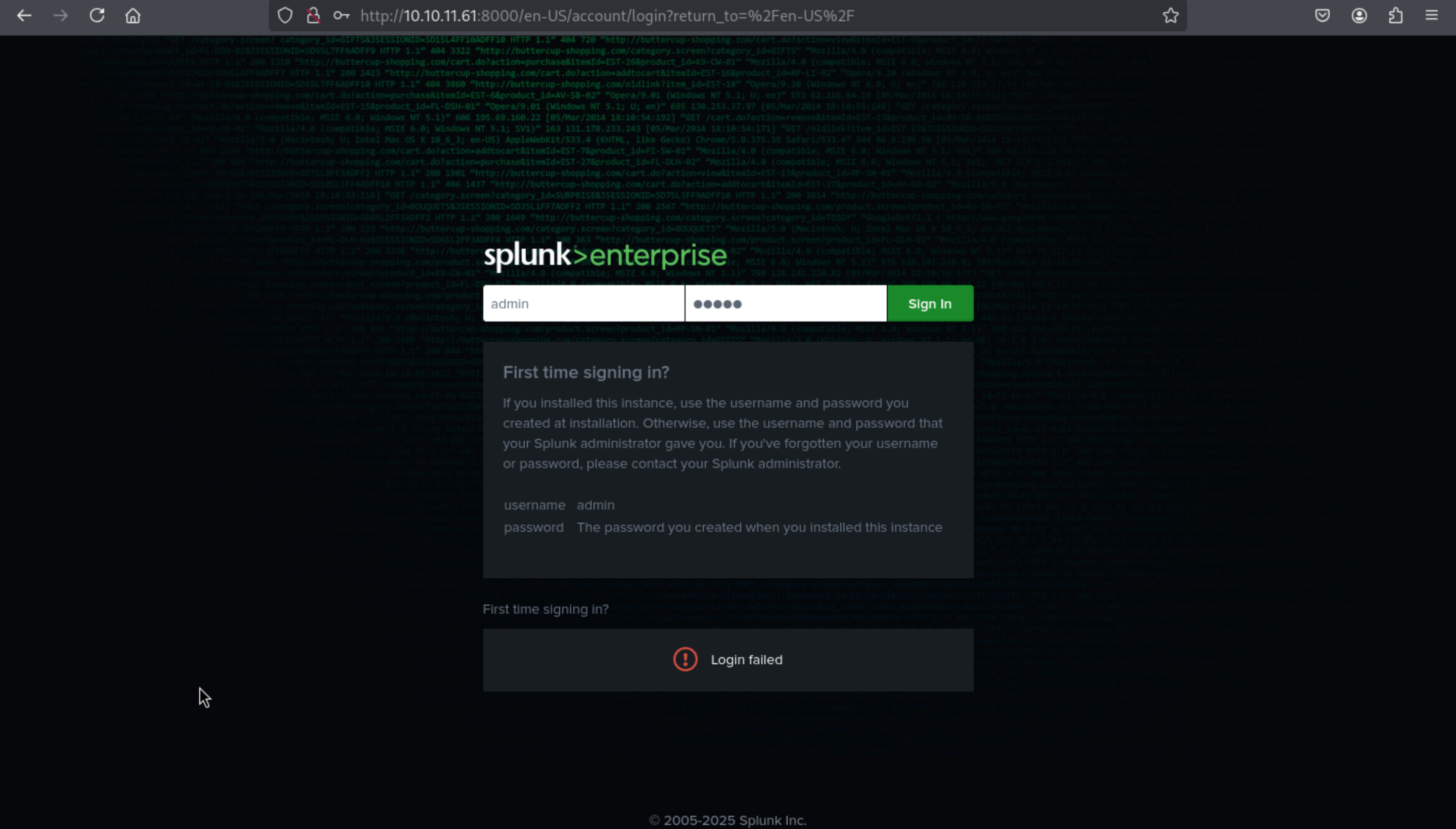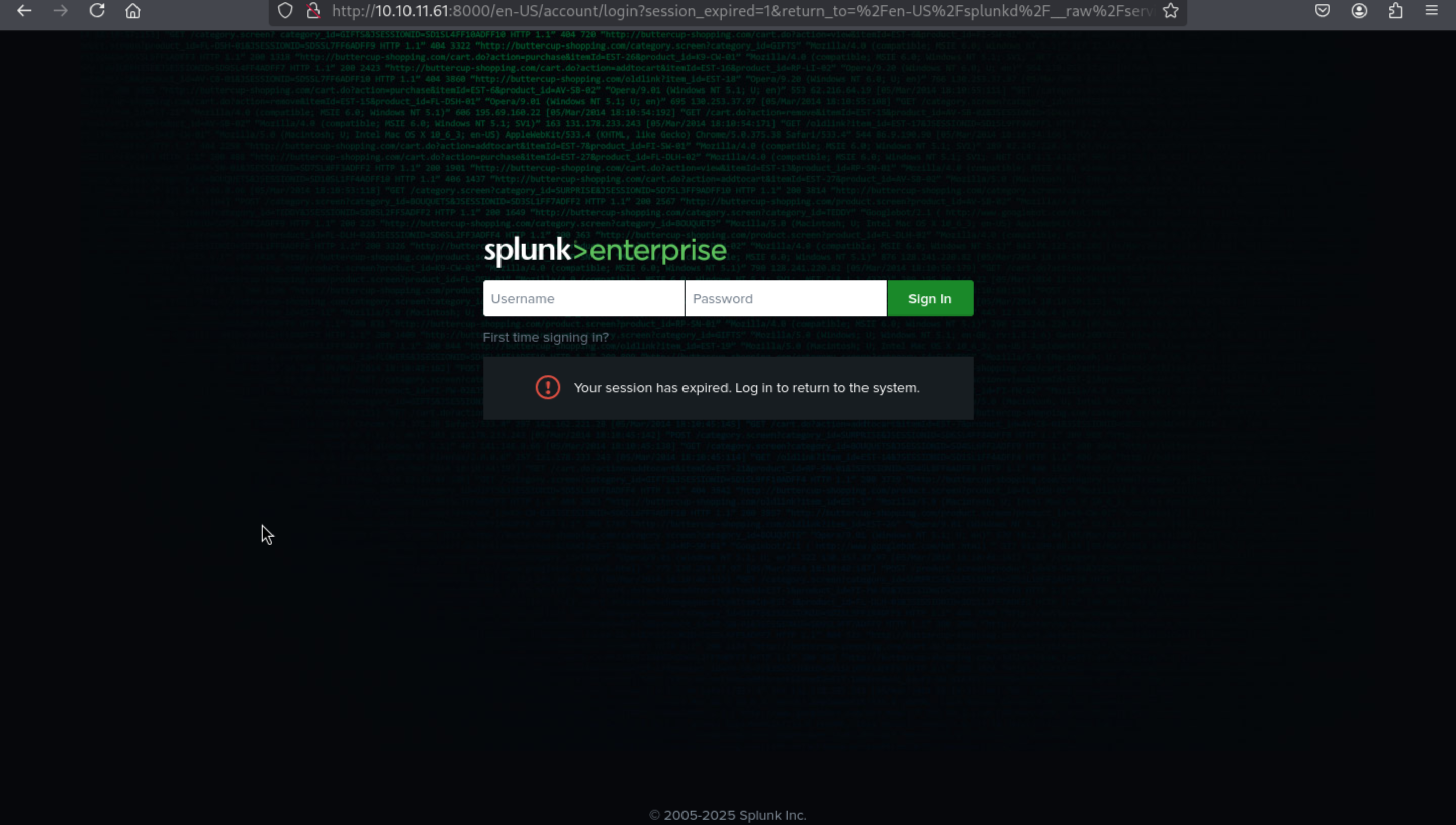 http://10.10.11.61:8000/en-US/account/login?return_to=%2Fen-US%2F [200 OK] Bootstrap, Cookies[cval,splunkweb_uid], Country[RESERVED][ZZ], HTML5, HTTPServer[Splunkd], IP[10.10.11.61], Meta-Author[Splunk Inc.], Script[text/json], probably Splunk, UncommonHeaders[x-content-type-options], X-Frame-Options[SAMEORIGIN], X-UA-Compatible[IE=edge]