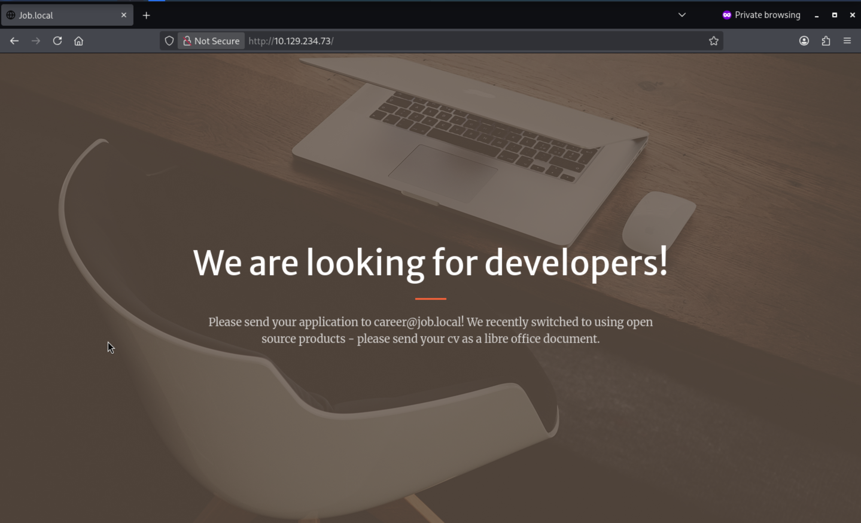 career@job.localseems like a valid email here, also we have found port 25 smtpservice is open, maybe we can try Phishing email attack.