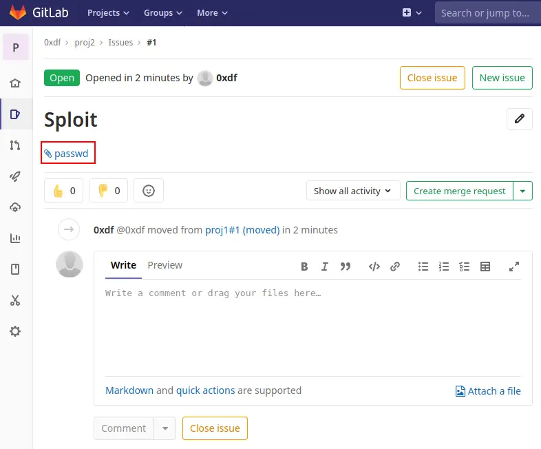 Then go into proj1 and create an issue with markdown language image reference where the image is a directory traversal payload pointing to the file I want: