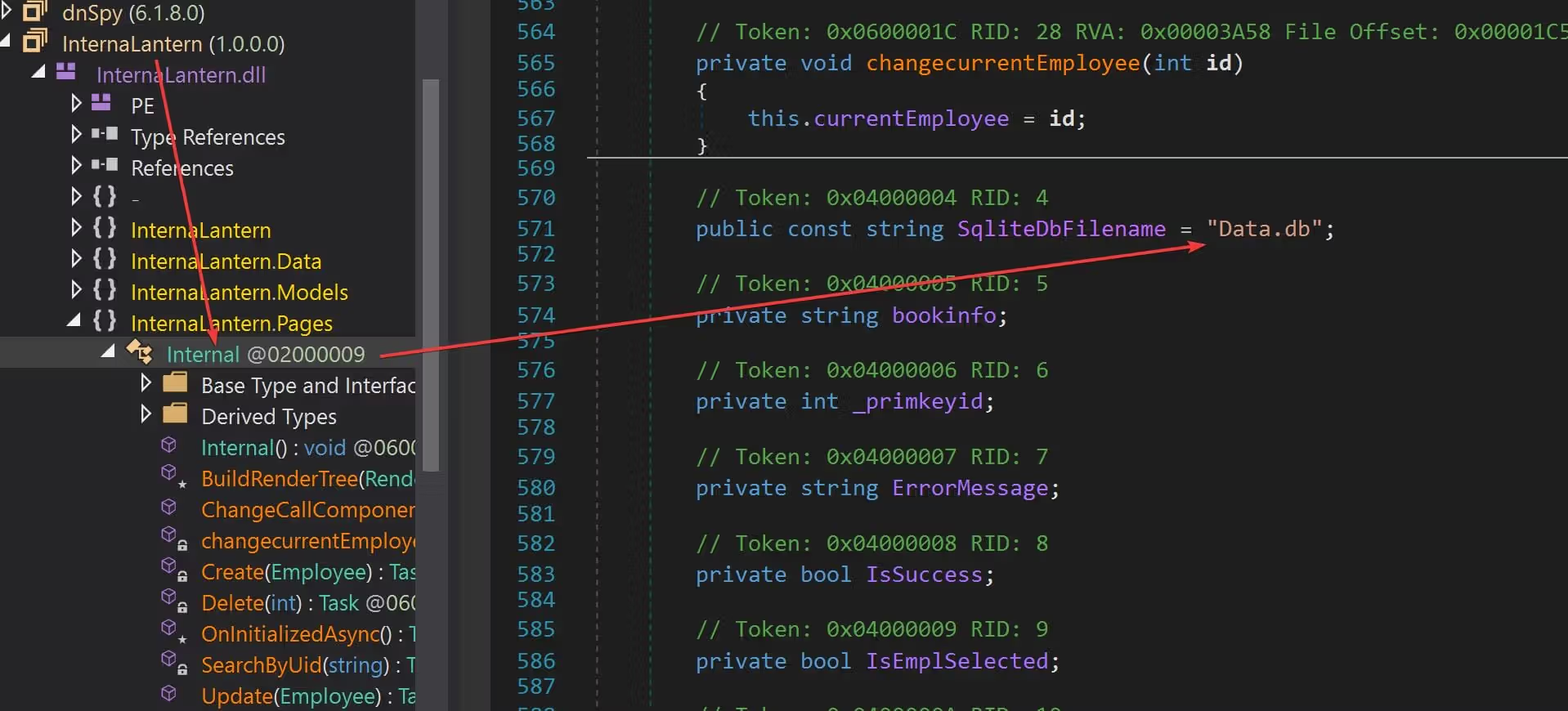 Use dnSpy to decompile the file and it’s code review time (it’s basically the source code of the InternaLantern app). First I identified a database name as Data.db: