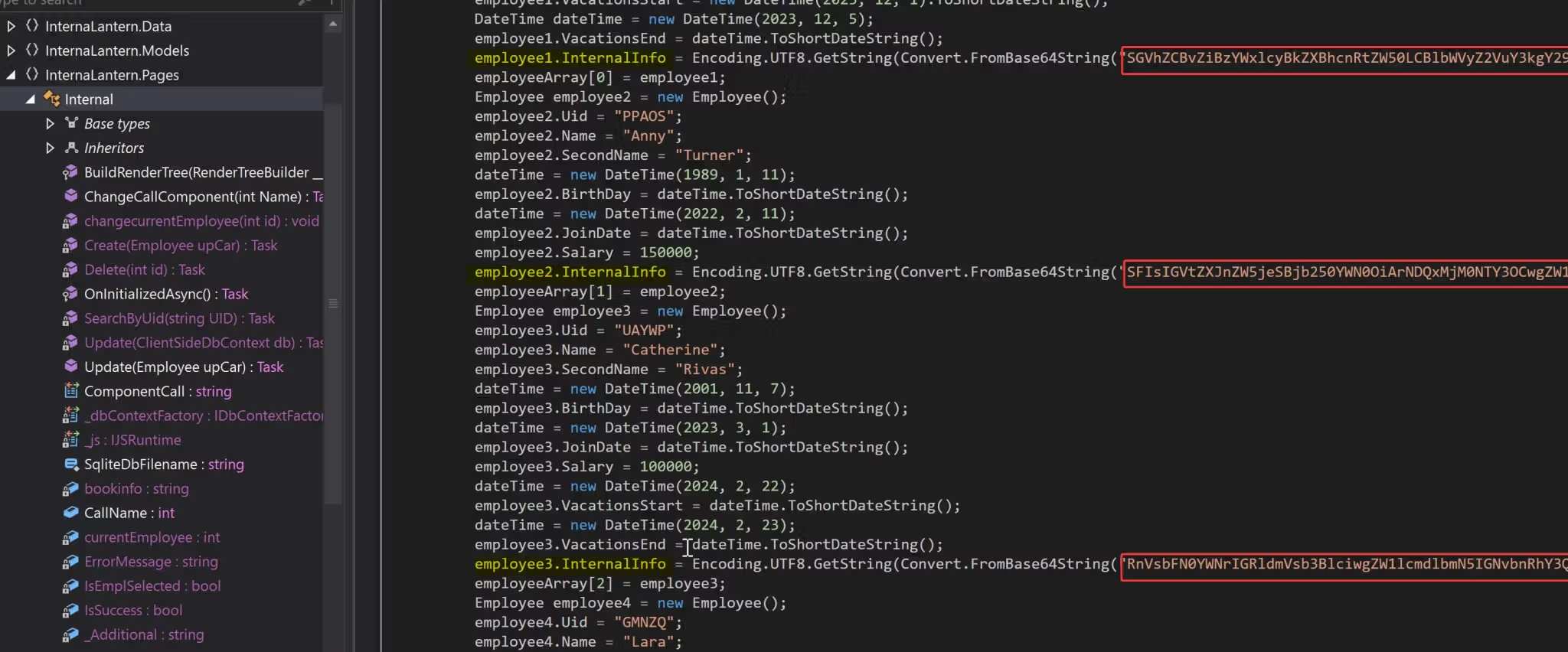 employee5.InternalInfo = Encoding.UTF8.GetString(Convert.FromBase64String("SnVuaW9yIC5ORVQgZGV2ZWxvcGVyLCBlbWVyZ2VuY3kgY29udGFjdDogKzQ0MTIzNDU2NzgsIGVtYWlsOiBsaWxhLnNAZXhhbXBsZS5jb20="));