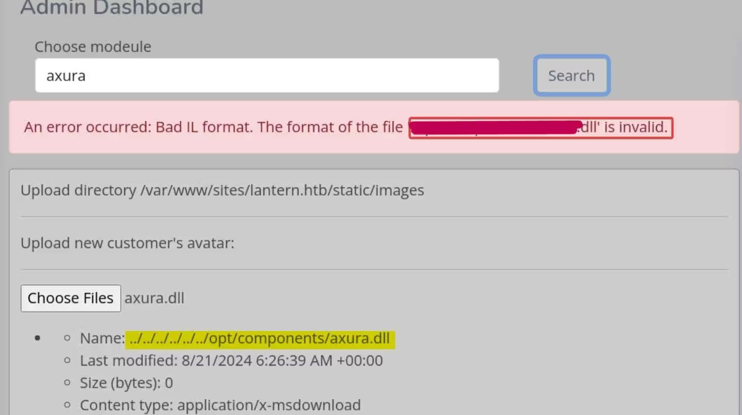The “Upload content” option in http://lantern.htb:3000 admin dashboard also suffers from path traversing. We can verify that by uploading an empty DLL file to our target path /opt/components.