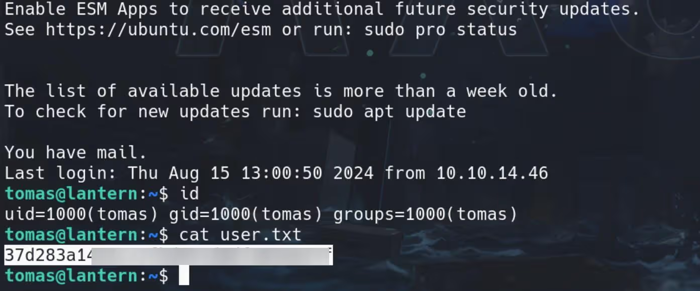 Modify the permission to 600, we can use it the remote log on the machine as user tomas, and compromise the user flag: