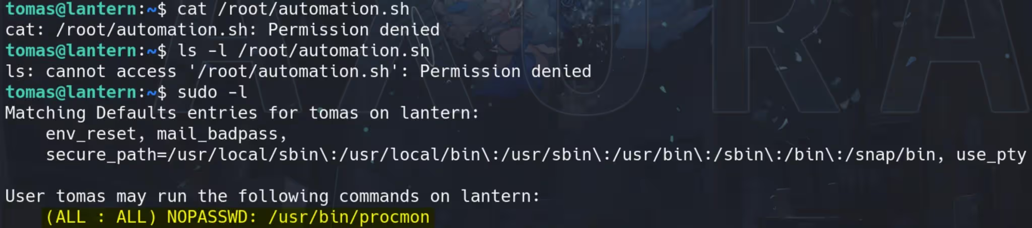 The file /root/automation.sh is not readable but we can check SUDO privilege, which may relate to this script: