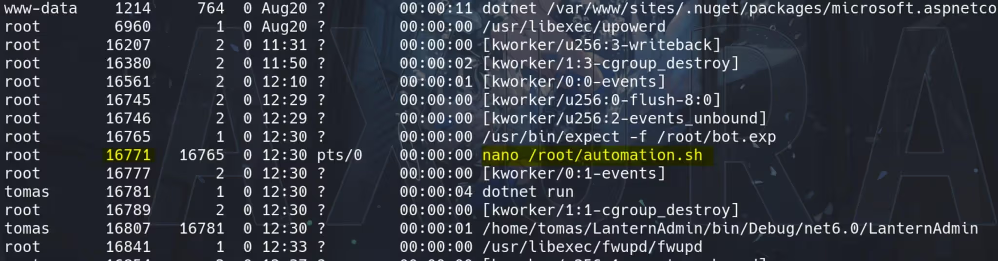 We found something interesting here. User root is somehow editing the suspicious file /root/automation.sh. Once we are able to write some malicious content into it, we may compromise the root user.