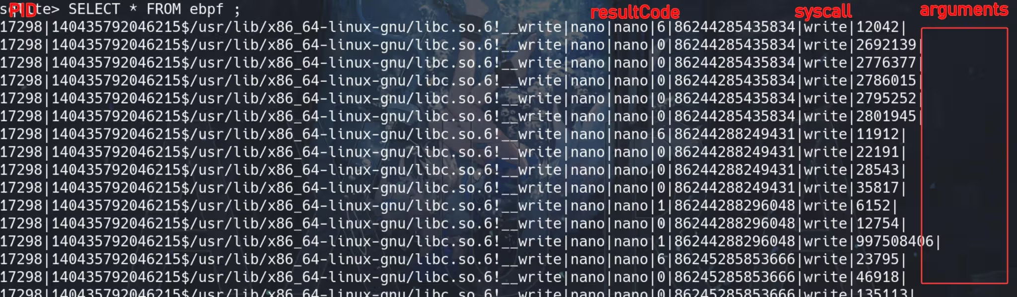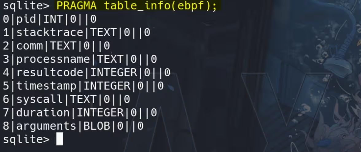 We can check the column names first to understand what it’s about with query PRAGMA table_info(ebpf);: