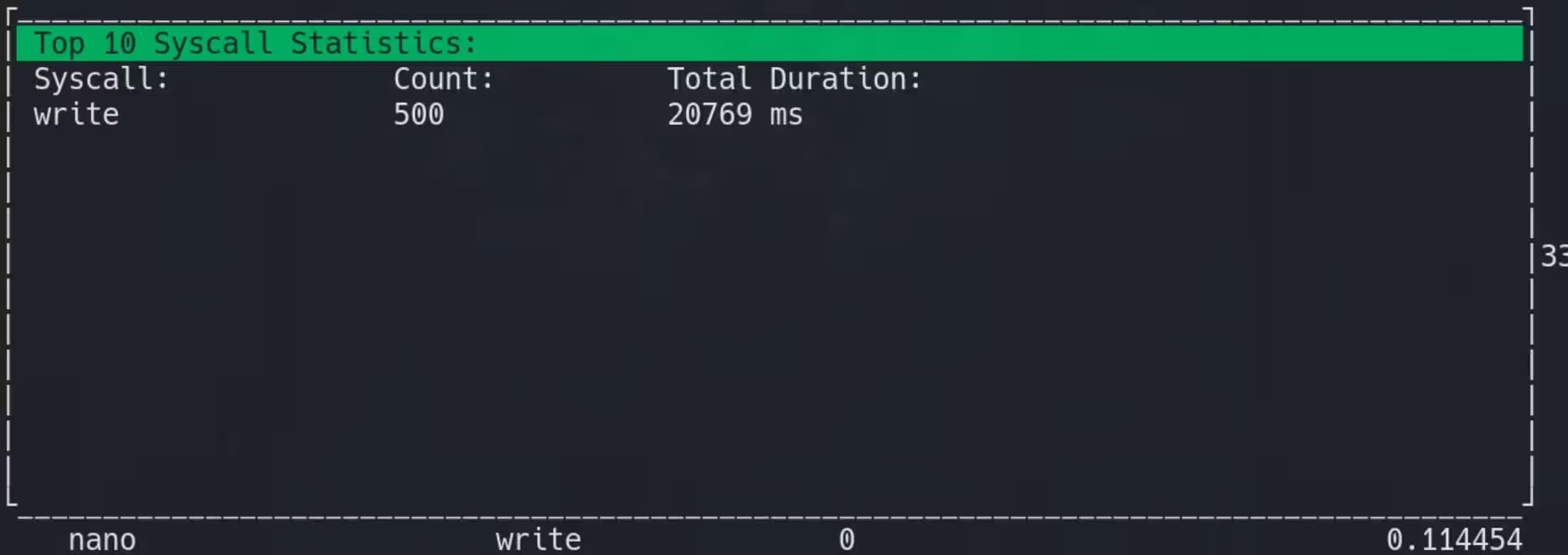 Comparing the data and the column names, we can the the Procmon is telling us that the Glibc had been calling the write syscall for the process.