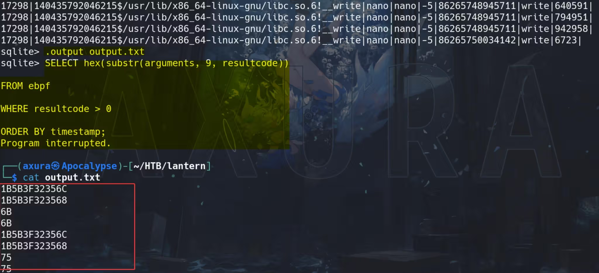 Thus, we can look up those BLOB data to see if there’s something interesting for what the root user keeps writing. Use .output output.txt to output specific data following by the next SQLite command: