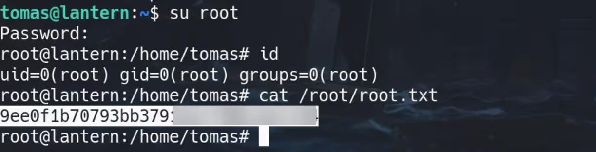 Well, the root user has shaky hands. We guess the password is duplicatedly depicted to us, that it should be Q3Eddtdw3pMB: Use the password and su root from tomas shell, we compromise root:
