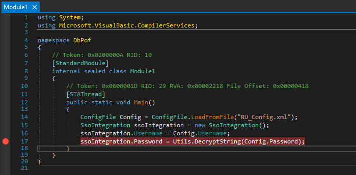 In this place, The RD() method then decrypts the string and returns the plaintext. A quick comparison between this method and one found in Utils.vb proves that they are the same. This means we can re-use the code from earlier and just change the parameters.