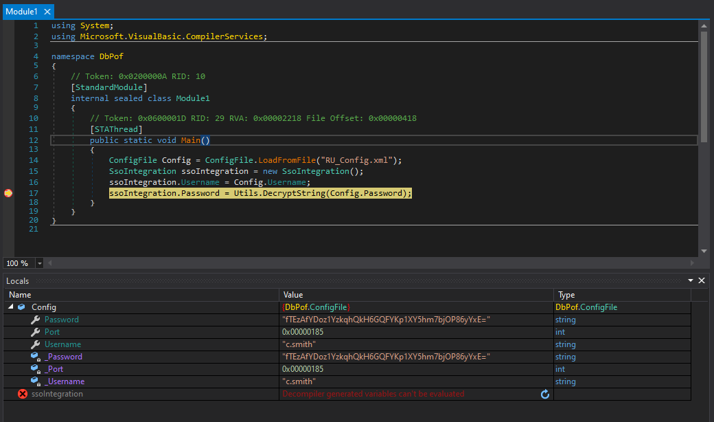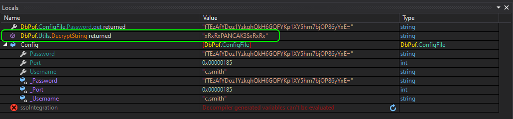 On hitting OK, it runs to my break point, and I can see the decrypted password: