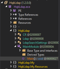 I’ll head back to my Windows VM, open dnSpy-x86 and load HqkLdap.exe. Just like last time, I’ll find Main():