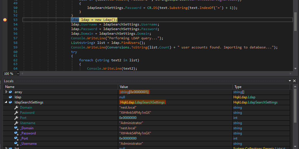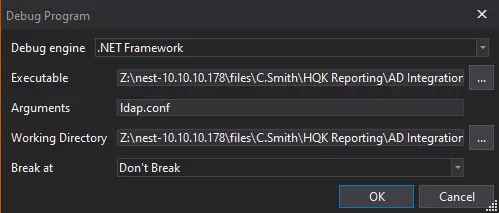 I’ll put a break point on the next line after the password is decrypted and set. I’ll select Debug -> Start Debugging…, and add ldap.conf as an argument: