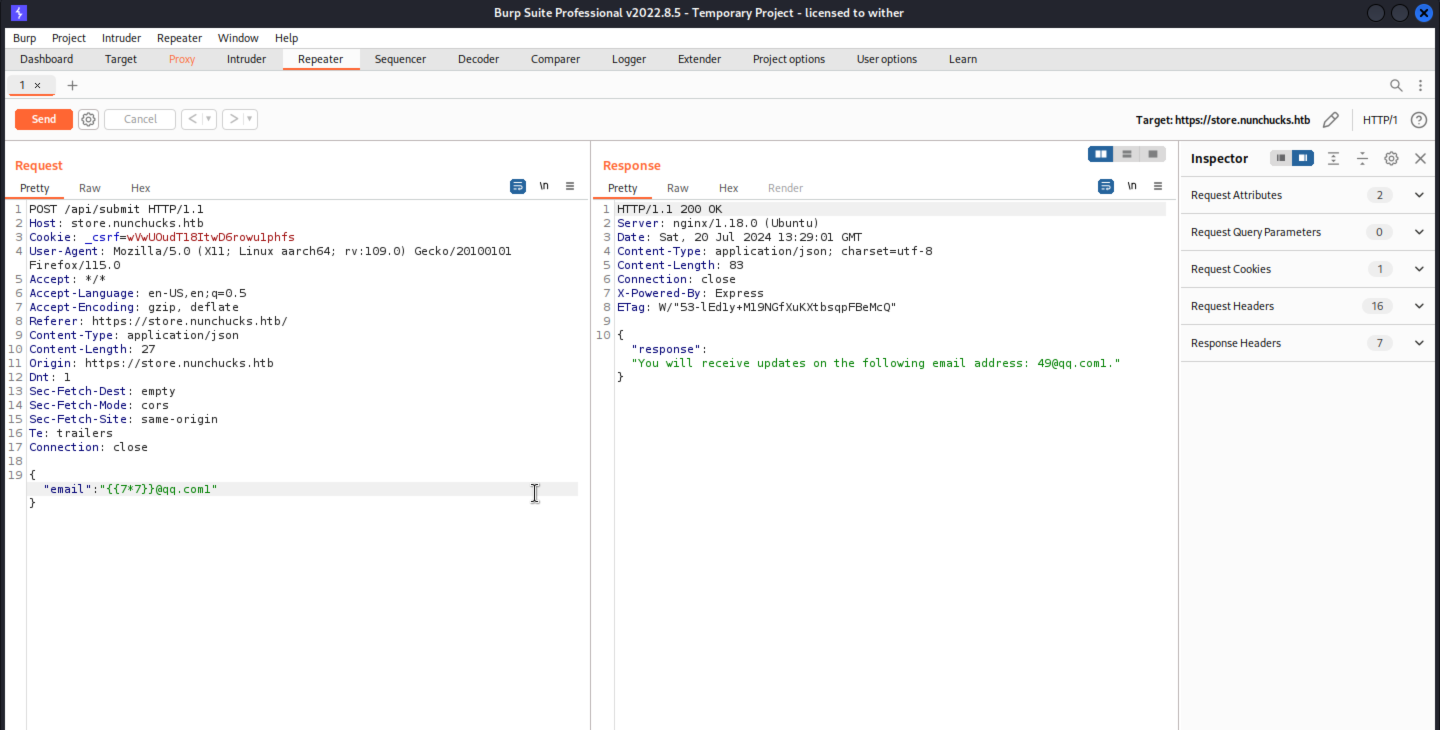 2, enumerate sub-domain Because of no useful information, we can also find some sub-domain of this website wfuzz -H "Host: FUZZ.nunchucks.htb" -w /usr/share/wordlists/SecLists/Discovery/DNS/subdomains-top1million-5000.txt --hh 30587 https://nunchucks.htb