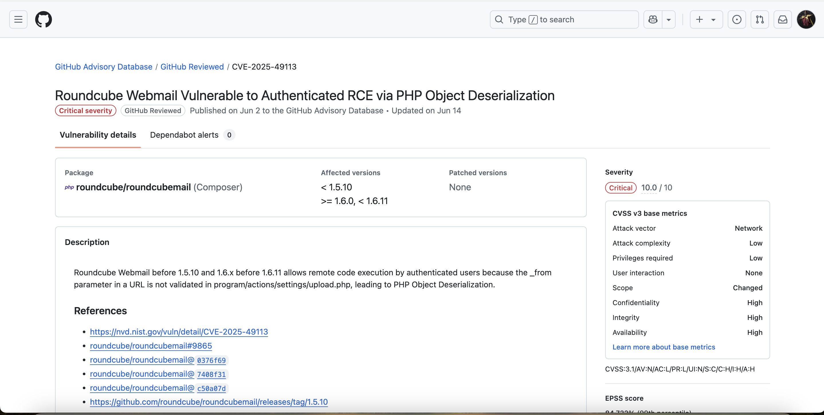 ### Roundcube ≤ 1.6.10 Post-Auth RCE via PHP Object Deserialization [CVE-2025-49113]