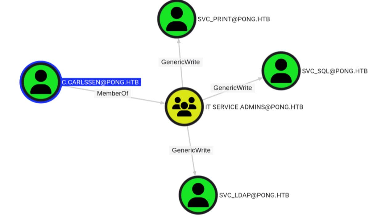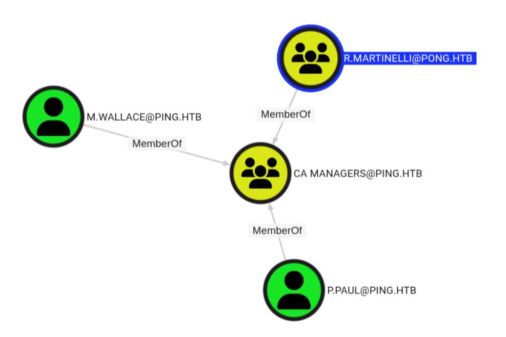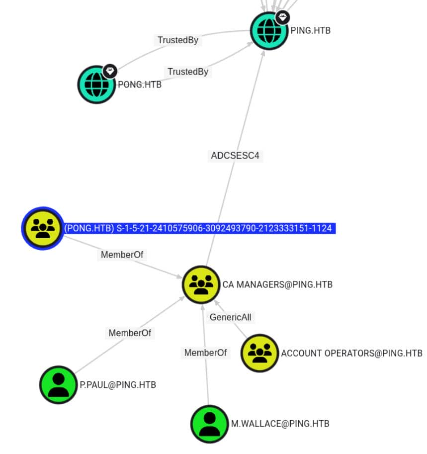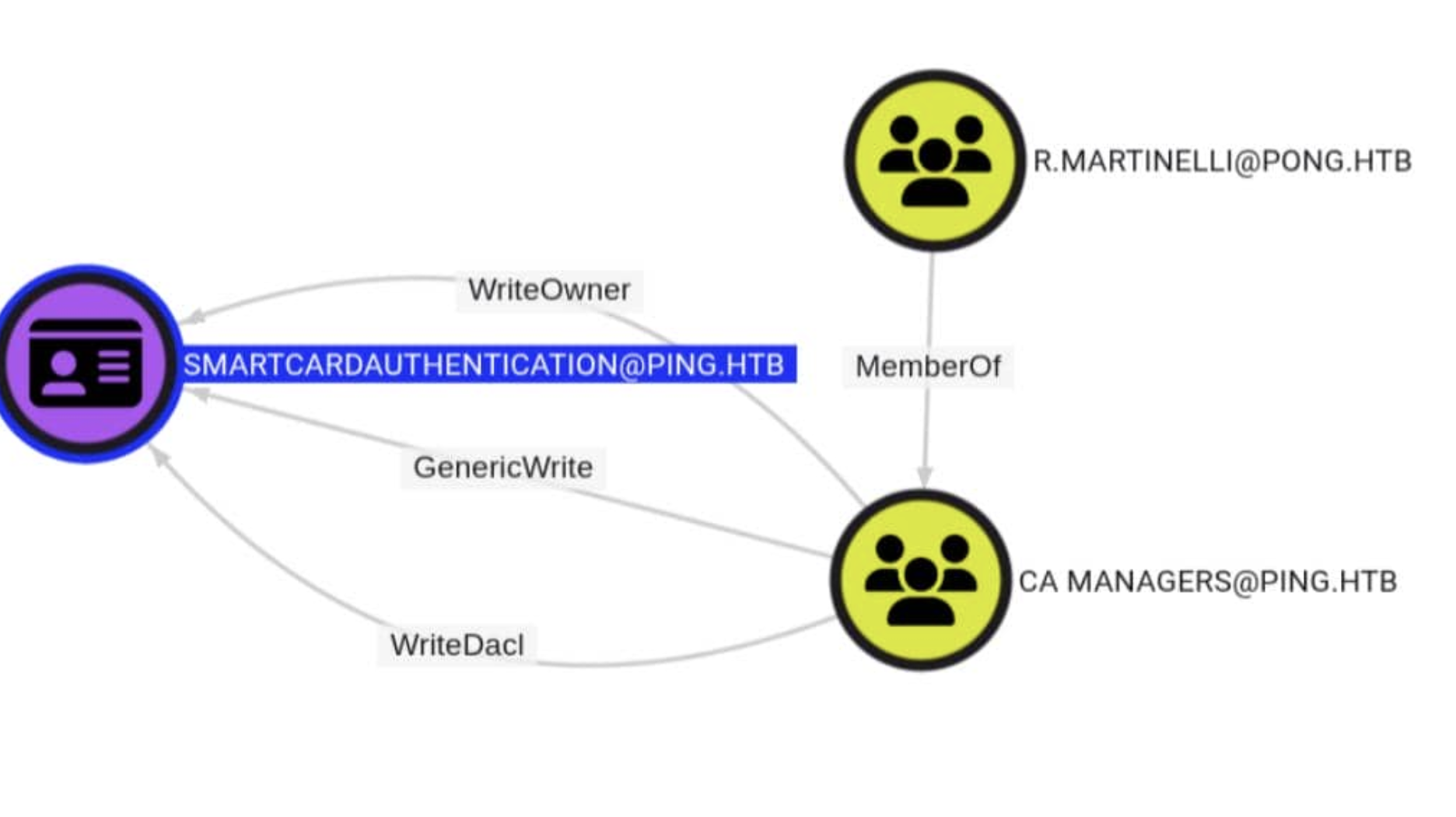 Within PONG, further enumeration exposes a path to DCSync privileges, leading to the compromise of R.Martinelli — a PONG user who holds membership in the CA Managers group back in PING.HTB. This cross-domain group membership is the key to the final phase: abusing GenericWrite and WriteDACL over the SmartcardAuthentication certificate template (ESC4) to rewrite it into an ESC1-exploitable template. With the template modified to allow subject supply and open enrollment, c.roberts requests a certificate impersonating Administrator@ping.htb, completing the forest takeover.