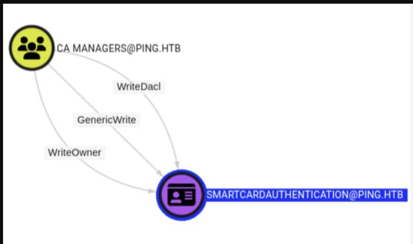 add genericAll 'CN=SmartcardAuthentication,CN=Certificate Templates,CN=Public Key Services,CN=Services,CN=Configuration,DC=ping,DC=htb' \