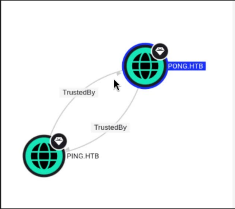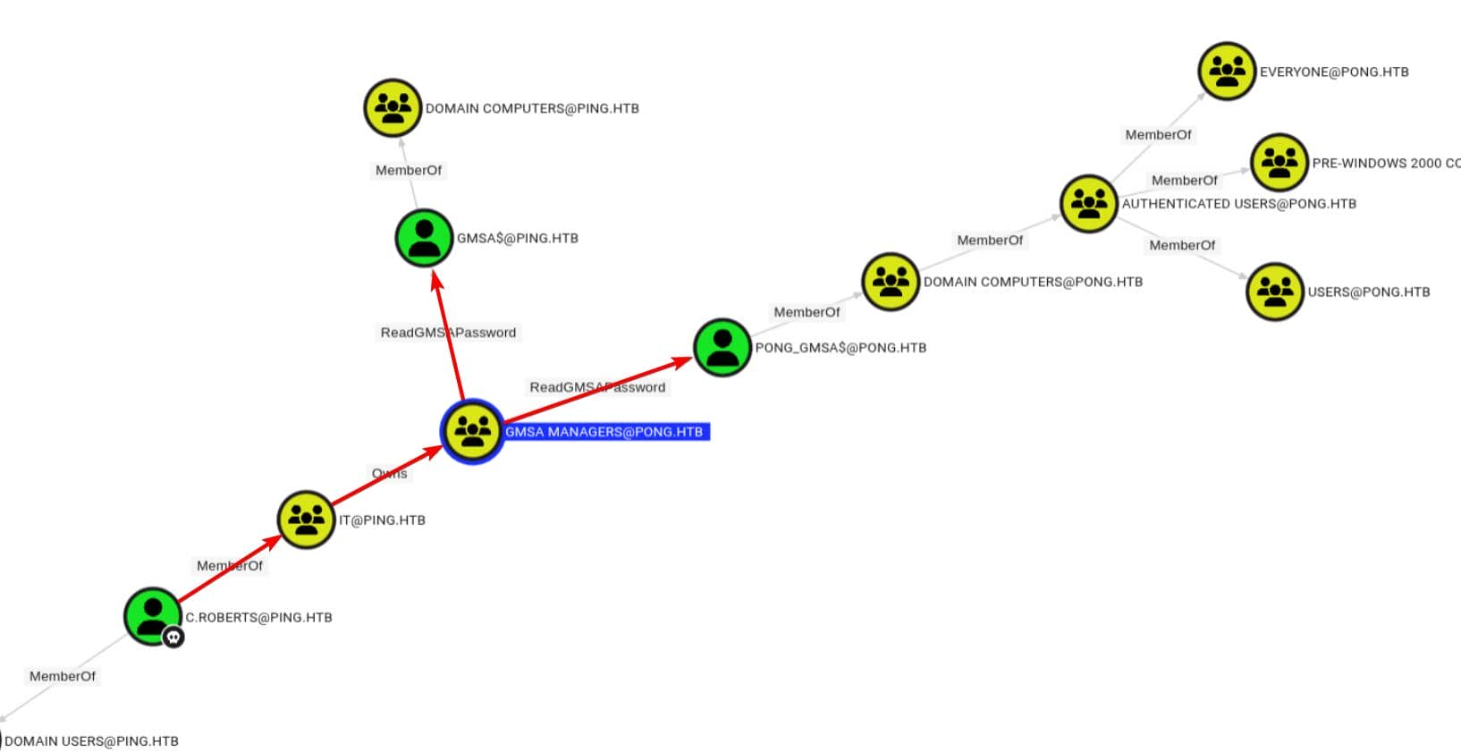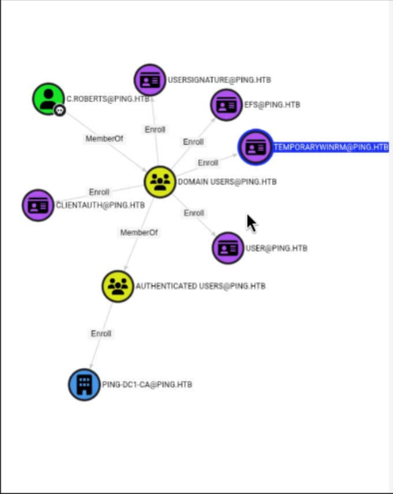 Initial enumeration with the provided c.roberts credentials reveals a rich AD environment. BloodHound analysis uncovers an ESC13 misconfiguration: a certificate template embeds an issuance policy OID that maps directly to the TempWinRMAccess group, granting c.roberts WinRM access to pivot deeper into the environment. From there, a gMSA password is recovered, enabling lateral movement into the second domain PONG.HTB via a cross-domain forest trust.
