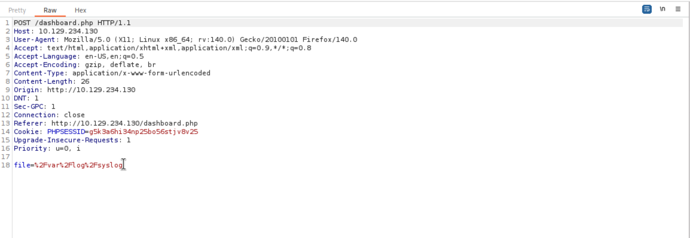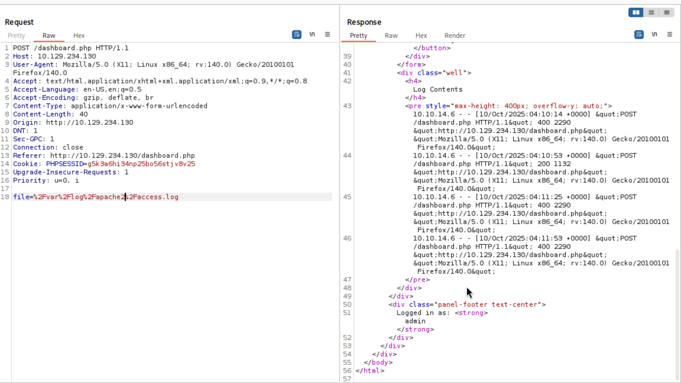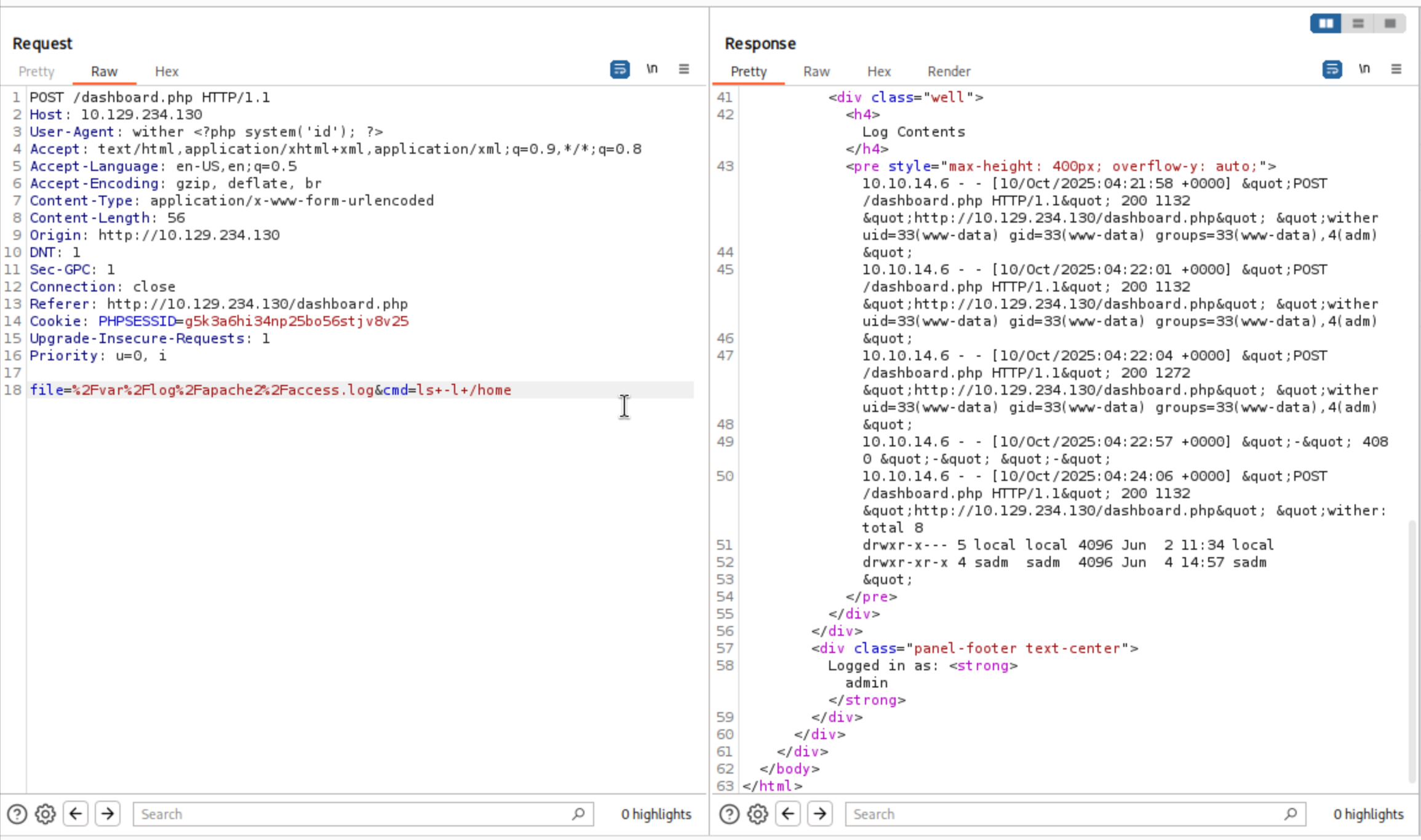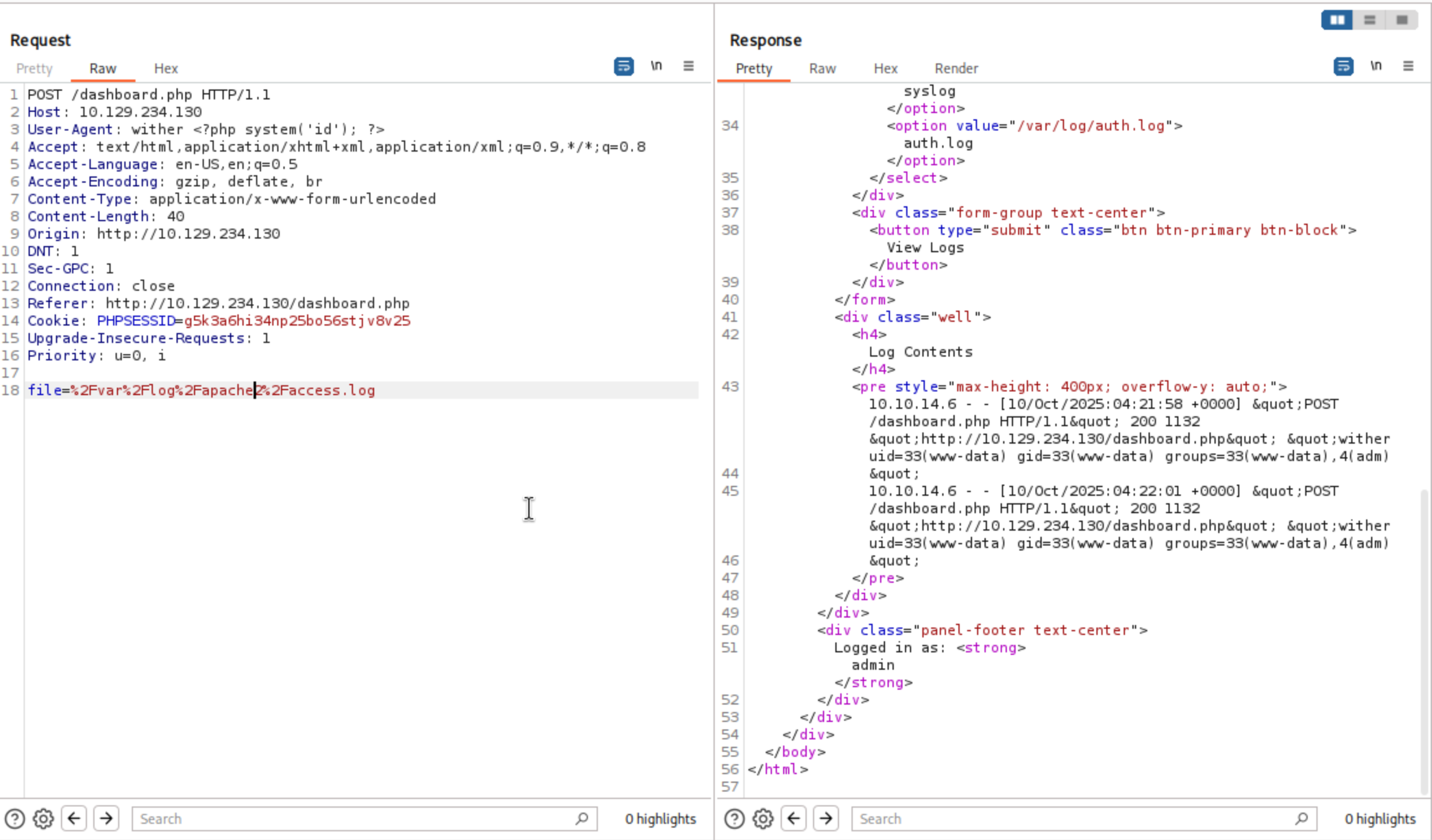 I can get my User-Agent header into the access.log file. I can put some PHP code into the access.log file and then execute it I’ll make a request with a simple PHP command in the User-Agent: