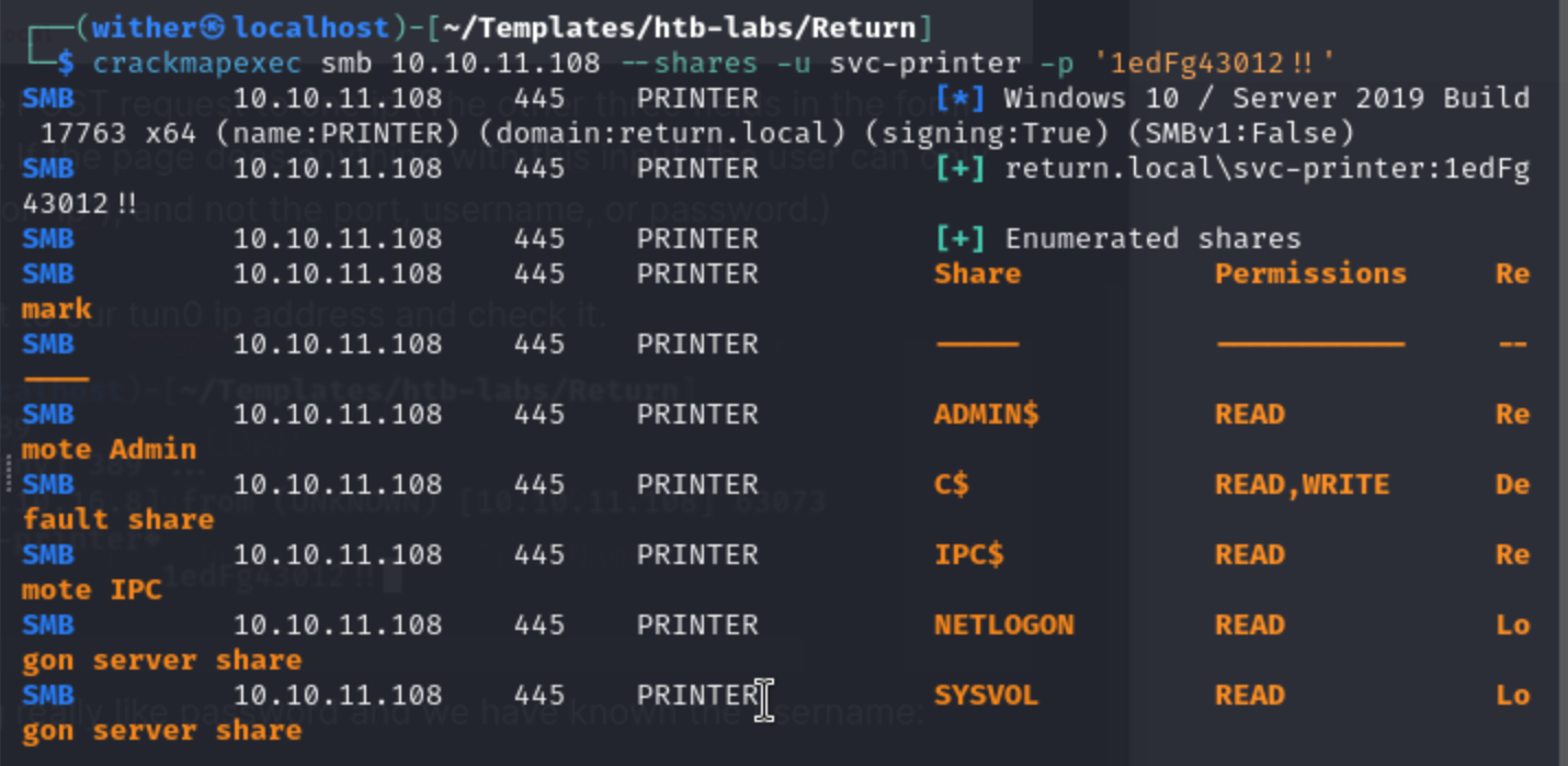 crackmapexec smb 10.10.11.108 --shares -u svc-printer -p '1edFg43012!!'