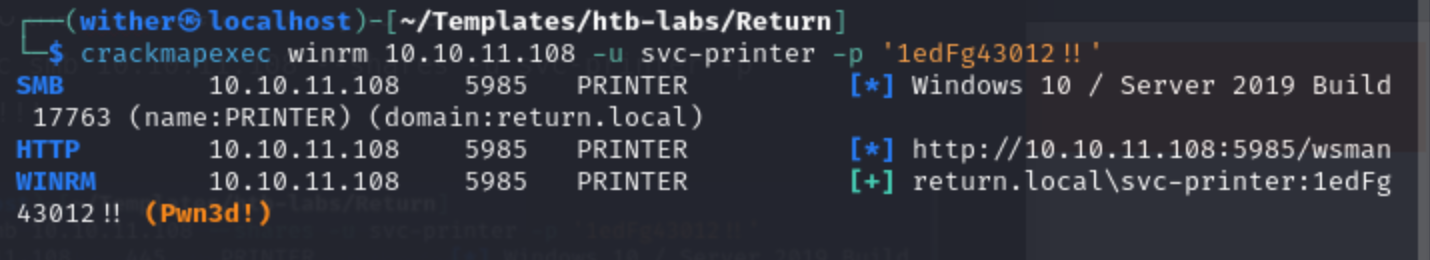crackmapexec shows that the hostname os PRINTER.return.local, and I need auth to get any additional information from SMB: