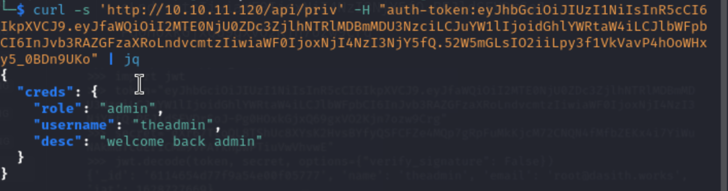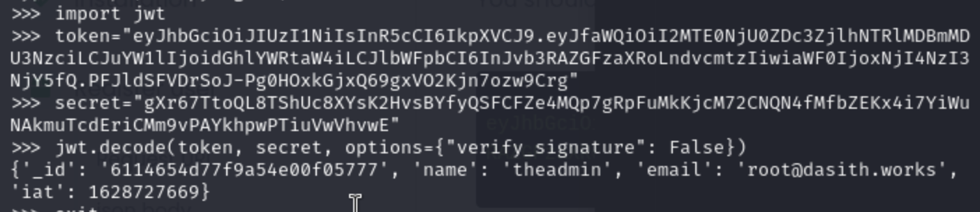 We have known "using JWT tokens to make things more secure" So we try to decode the token of documents `` eyJhbGciOiJIUzI1NiIsInR5cCI6IkpXVCJ9.eyJfaWQiOiI2MTE0NjU0ZDc3ZjlhNTRlMDBmMDU3NzciLCJuYW1lIjoidGhlYWRtaW4iLCJlbWFpbCI6InJvb3RAZGFzaXRoLndvcmtzIiwiaWF0IjoxNjI4NzI3NjY5fQ.PFJldSFVDrSoJ-Pg0HOxkGjxQ69gxVO2Kjn7ozw9Crg`