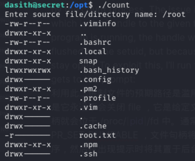 The intended path to exploit this binary is to abuse the file descriptors in use by the count process. The issue in the source code is that it never closes file, which is the handle to the given filepath. That means that as long as the program is running, the handle will be in /proc/[pid]/fd. Typically this would be flushed on the setuid, but because of PR_SET_DUMPABLE, the file handles will stay open. To exploit this, I’ll run the program, and then background it when it gets to the prompt: 利用此二进制文件的预期路径是滥用 count 进程使用的文件描述符。源代码中的问题是它永远不会关闭 file ,它是给定文件路径的句柄。这意味着只要程序正在运行,句柄就会位于 /proc/[pid]/fd 中。通常这会在 setuid 上刷新,但由于 PR_SET_DUMPABLE ,文件句柄将保持打开状态。为了利用这一点,我将运行该程序,然后在出现提示时将其置于后台
