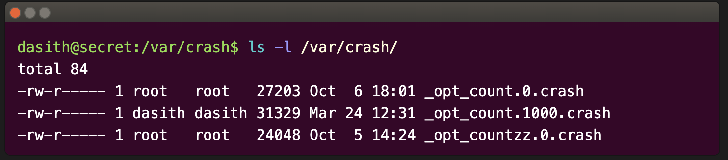 There’s a comment in the source // Enable coredump generation. That’s a good hint to try generating a crash of the process. When a program crashes, the system stores the crash dump files in /var/crash. There’s actually already two there: 源代码中有一条注释 // Enable coredump generation 。这是尝试生成进程崩溃的一个很好的提示。当程序崩溃时,系统将故障转储文件存储在 /var/crash 中。实际上已经有两个了